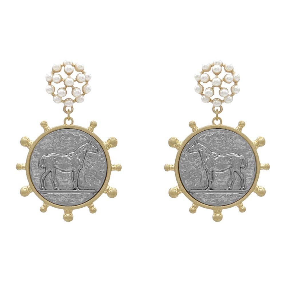 HORSE MEDALLION PEARL BEAD DANGLE EARRING, ER 10396