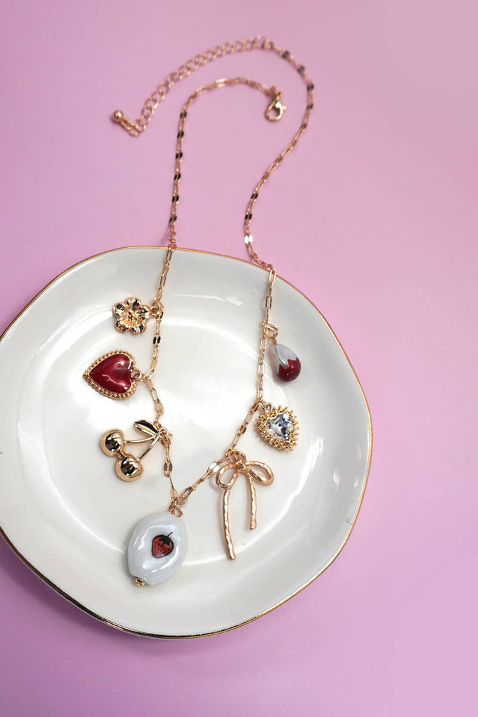 Embrace coastal elegance with this delicate charm necklace featuring beautifully crafted center piece porcelain strawberry, red heart, gold cherry, bow, and rhinestone heart set on a sleek chain, this piece captures the essence of seaside charm with a refined, artisanal touch.