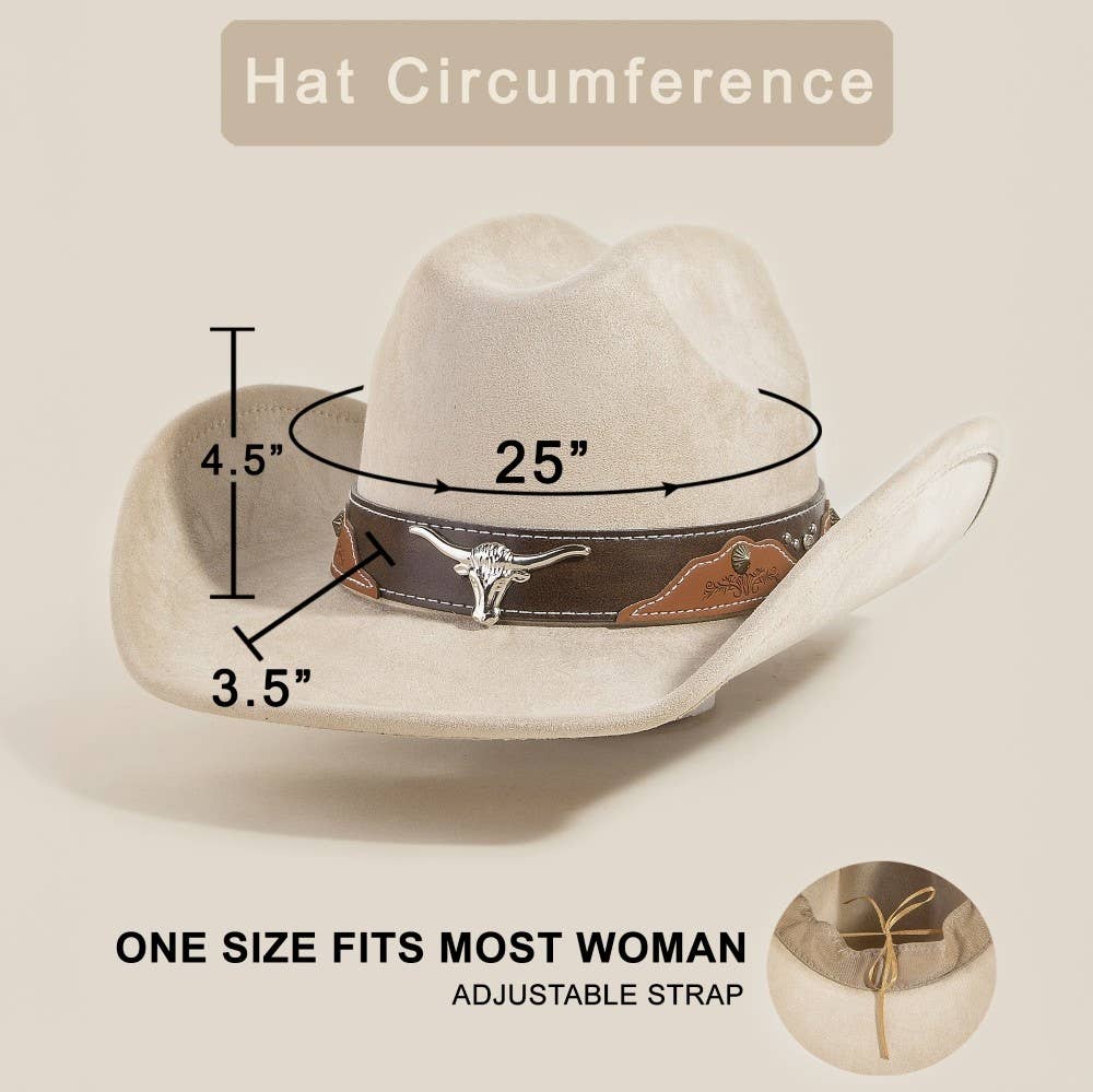 A contemporary masterpiece, this cowboy hat introduces an exceptional western long horn faux leather strap design. Achieve a perfect blend of style and sophistication with this versatile cowboy hat, a fashion-forward choice for any occasion. Available in BK, CO, LBR, TP. This item is sold in packs of 1. This cowboy hat is made with 90% Polyester and 10% Alloy.