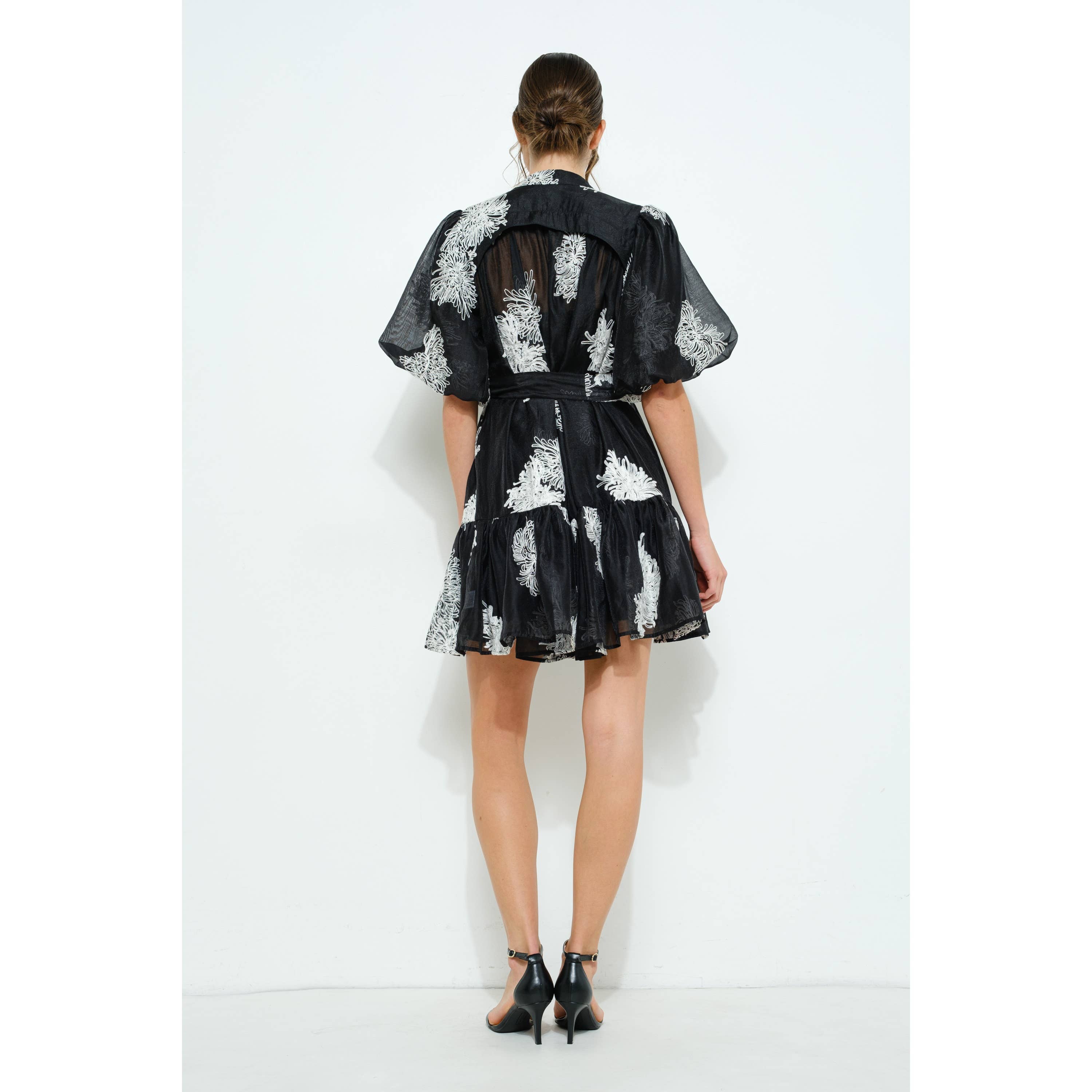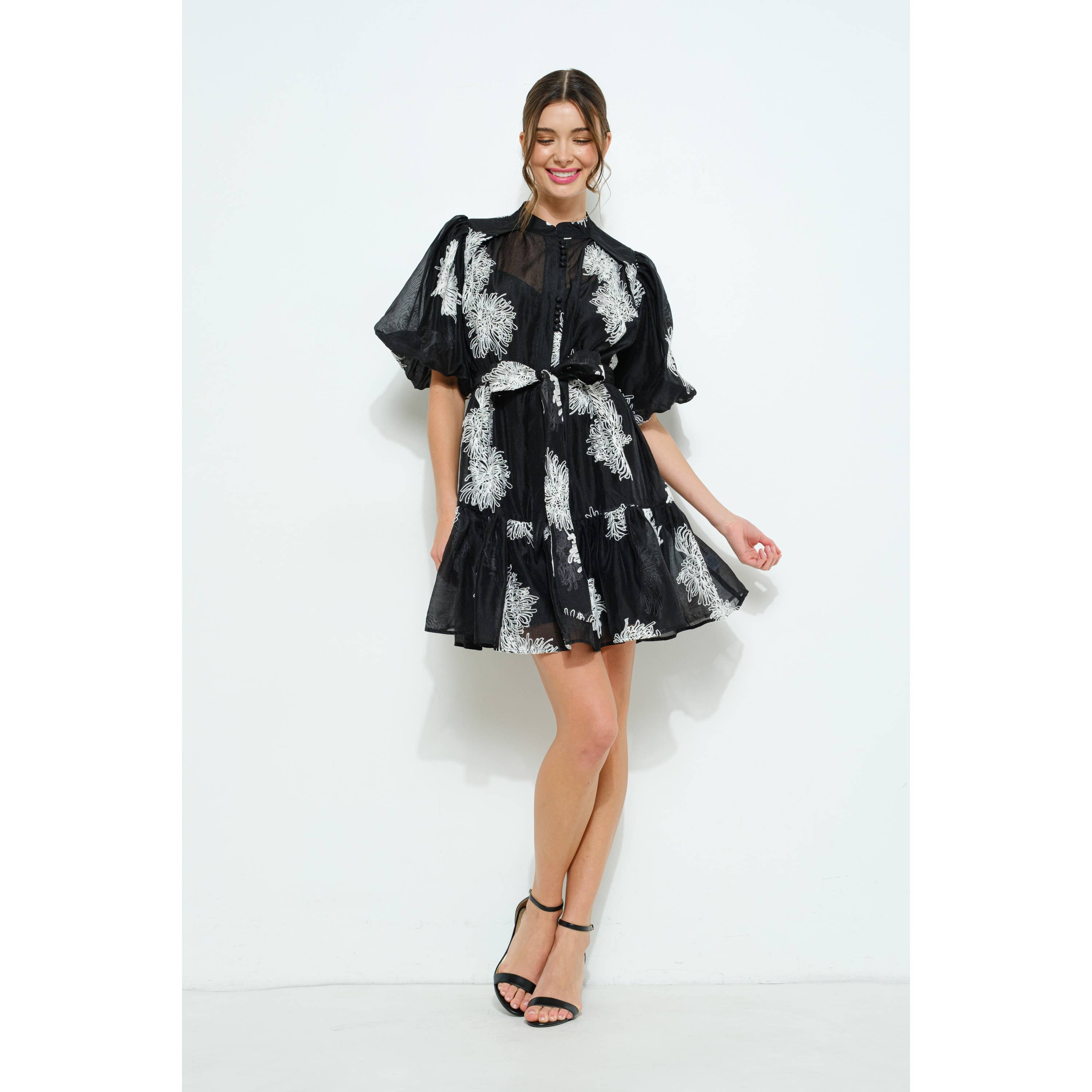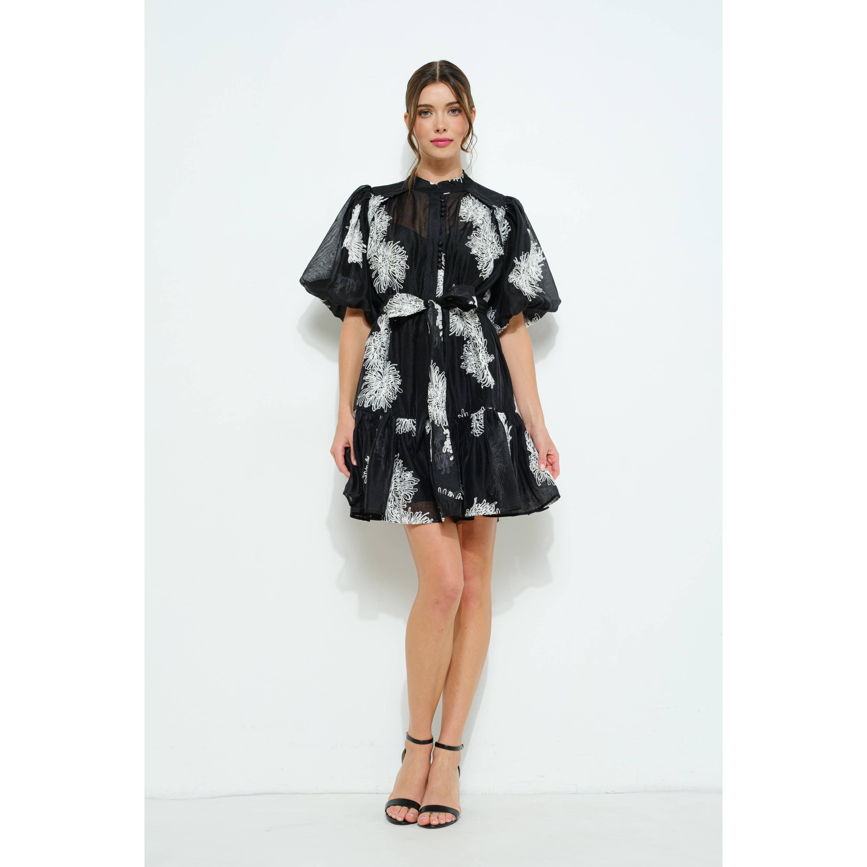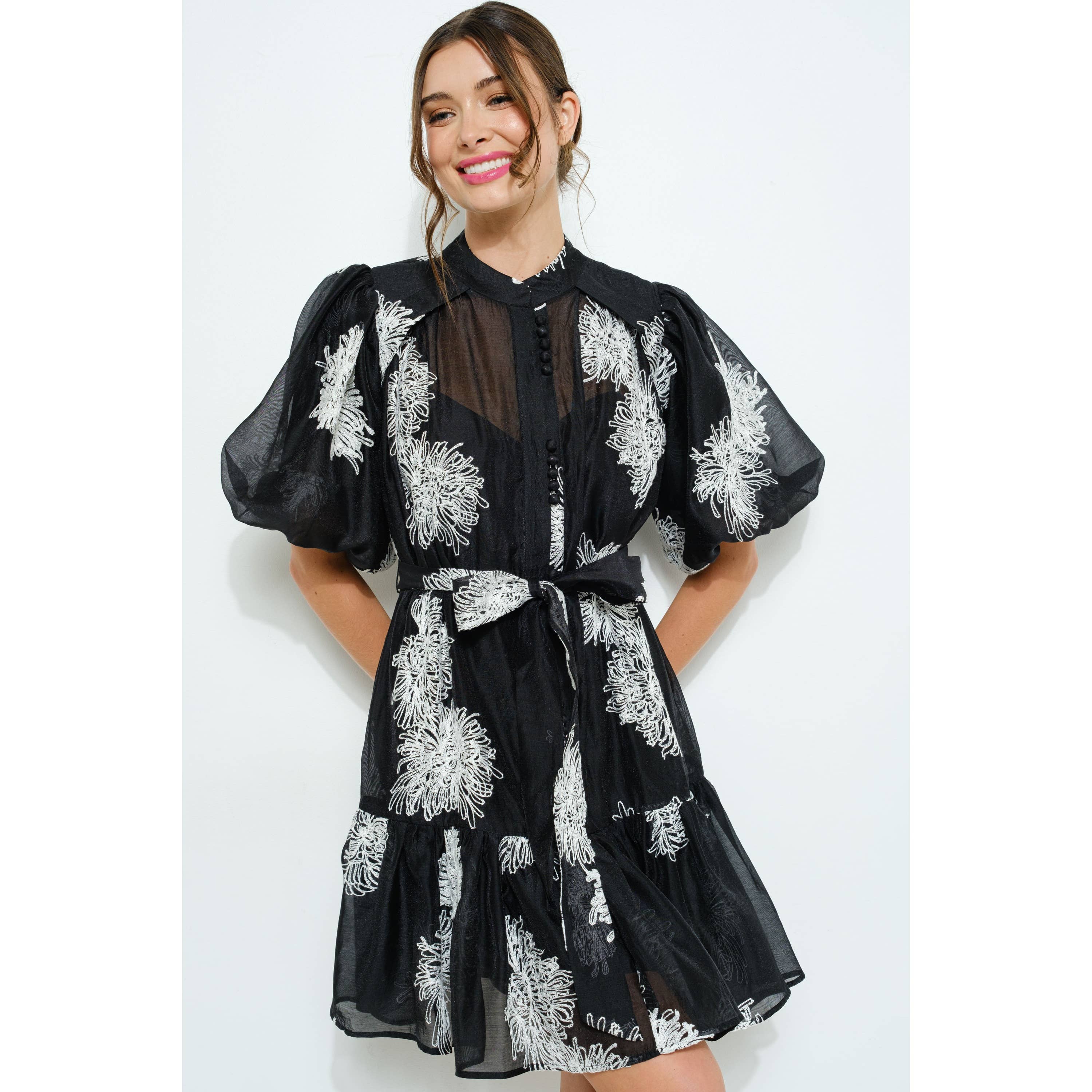 Embroidered Sheer Puff Sleeve Mini Dress -Sheer fabric with intricate floral embroidery -Puff sleeves for a soft, romantic silhouette -Button-up front with a sheer chest panel for a delicate touch -Structured shoulder detail enhancing the design -Waist tie accentuating the figure -Perfect for garden parties or elegant brunches -Model is 5'9.5" and is wearing a size small SHELL:100%POLYESTER LINING:100%POLYESTER