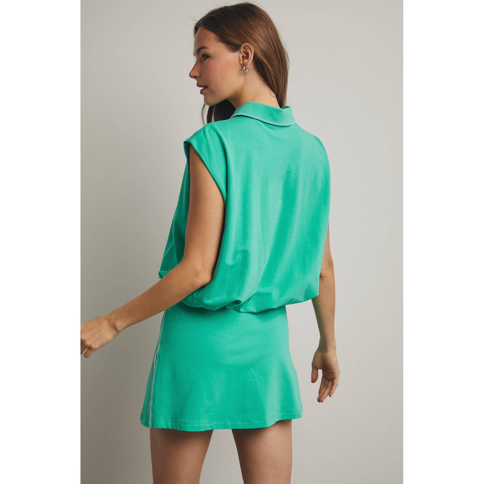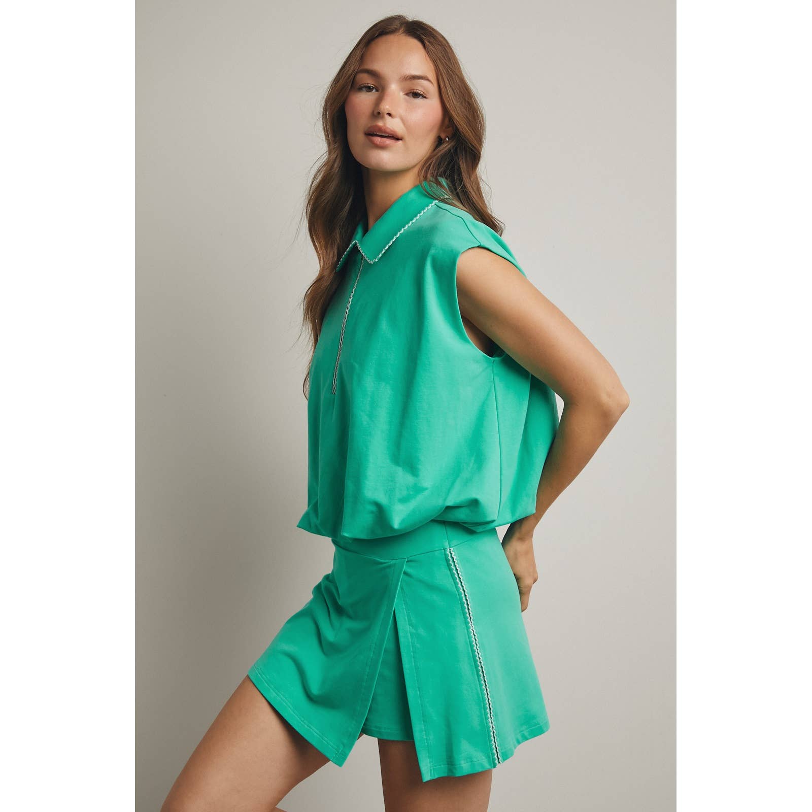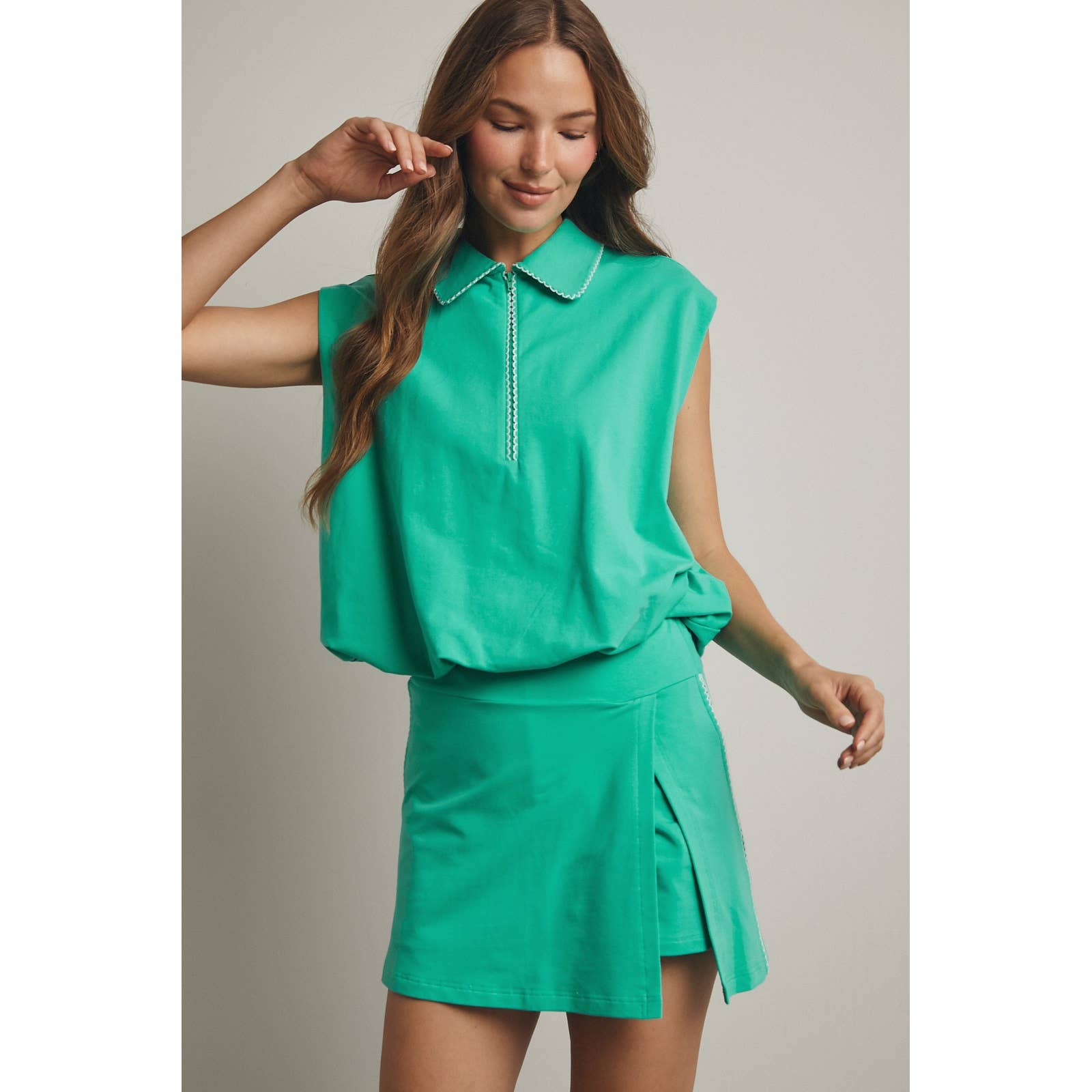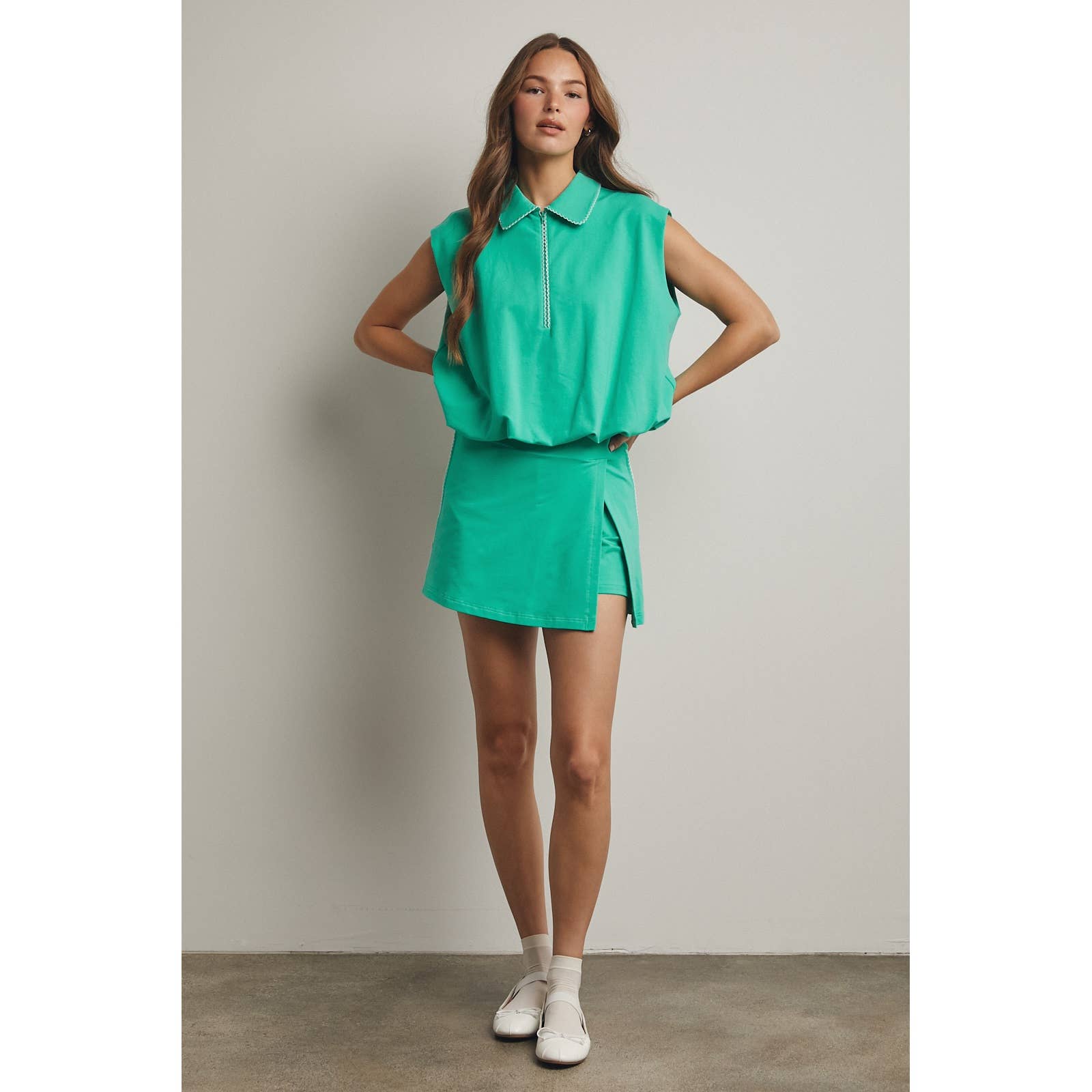 BUBBLE HEM TOP AND SKORT SET - TOP: HALF-ZIP CLOSURE - BOTTOM: ELASTIC WAISTBAND, SHORTS LINING - GOLF THEMED, LOOSE AND COMFORTABLE, PERFECT FOR TEE TIME SMALL: TOTAL LENGTH - 14 1/4" MODEL IS WEARING SIZE SMALL. SELF: 95% COTTON, 5% SPANDEX LINING: 95% POLYESTER, 5% SPANDEX