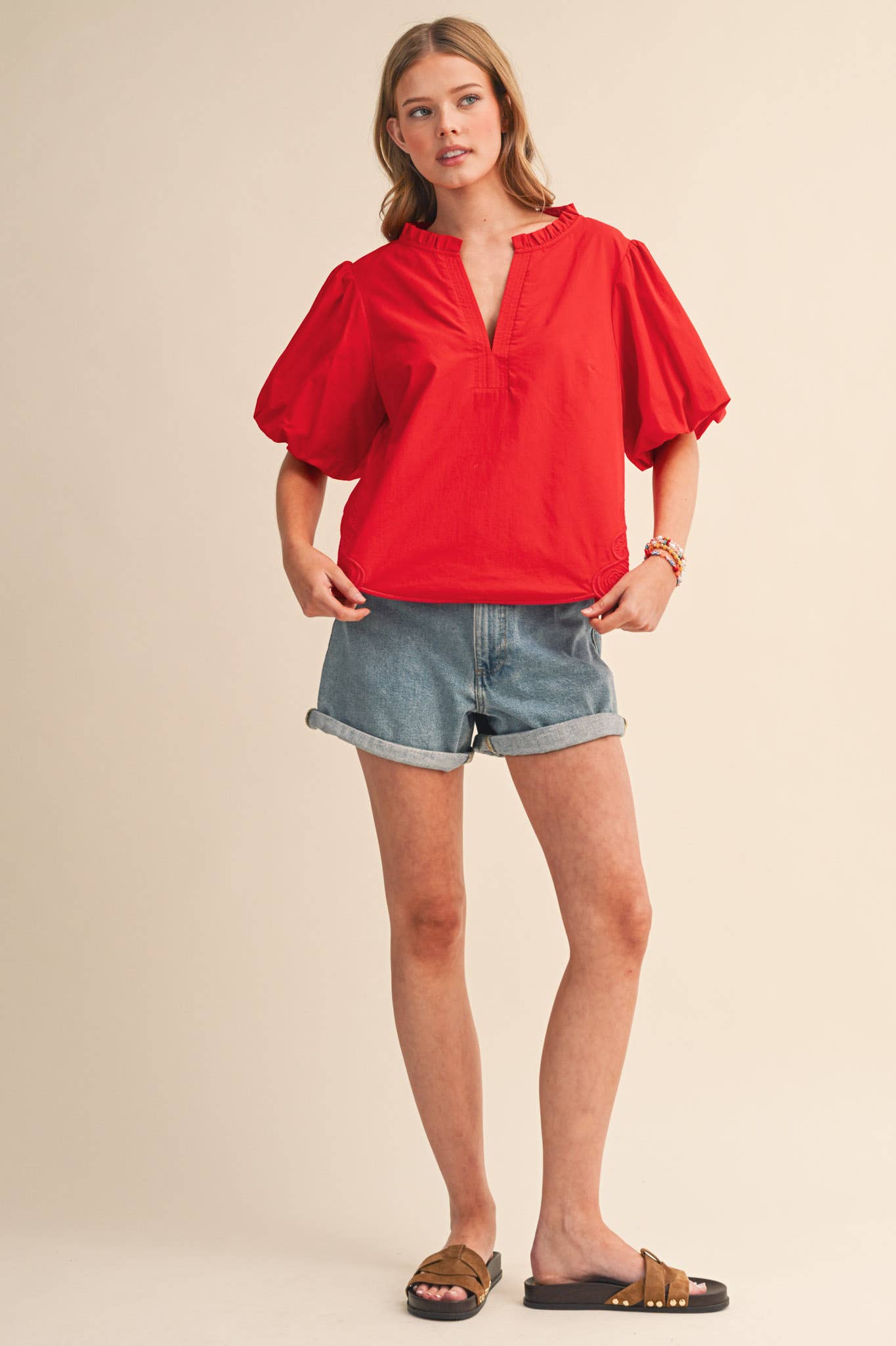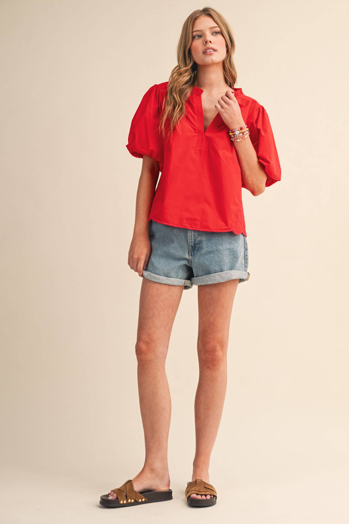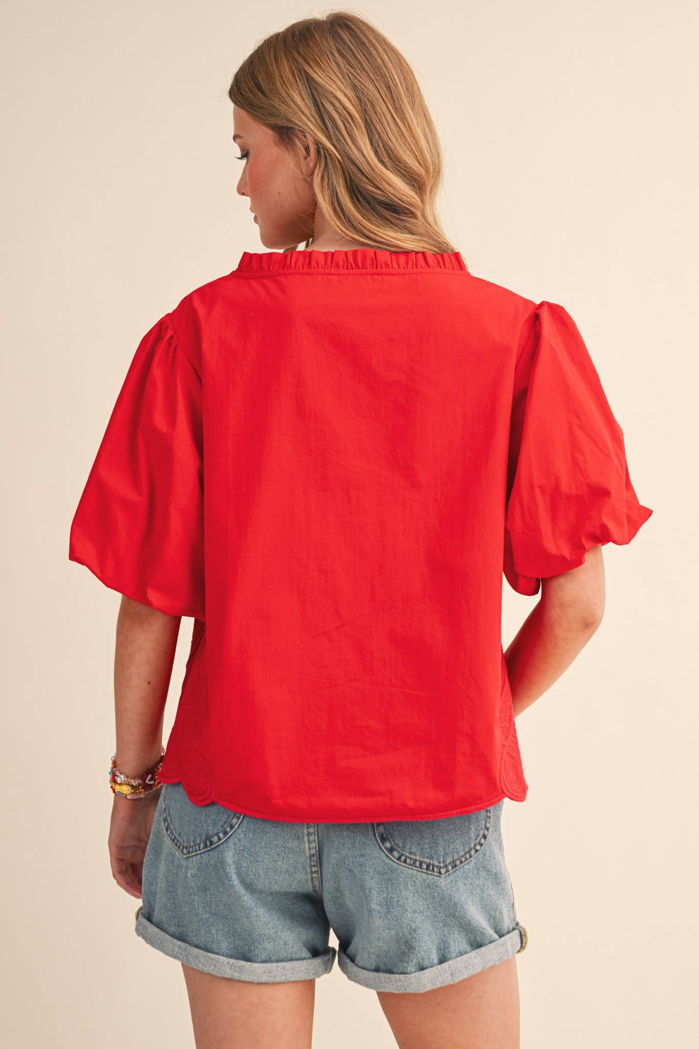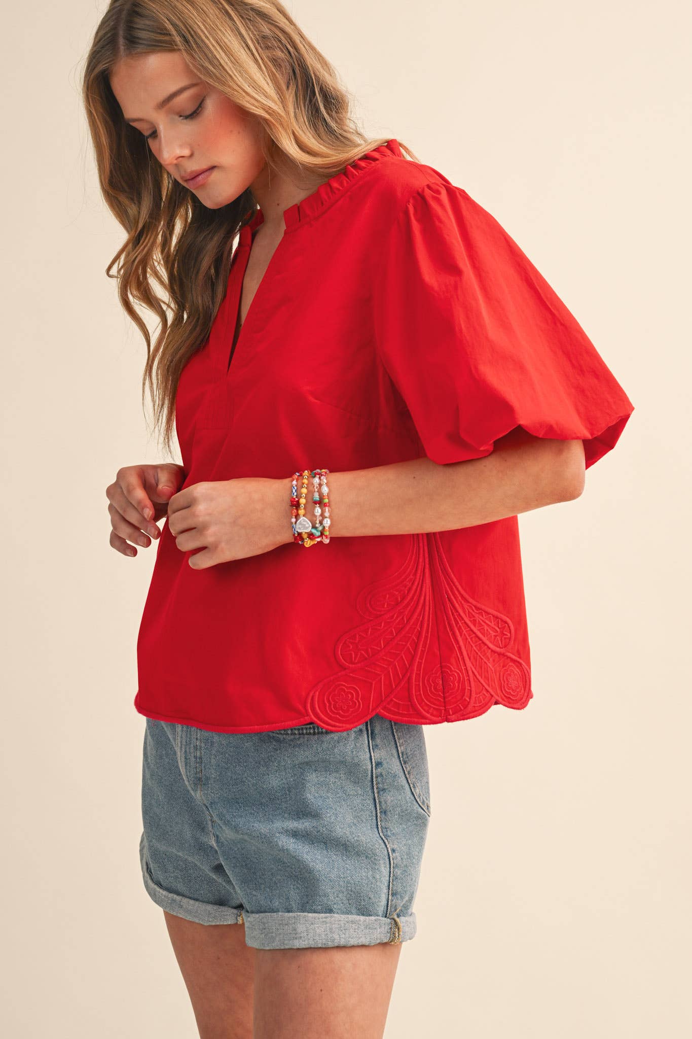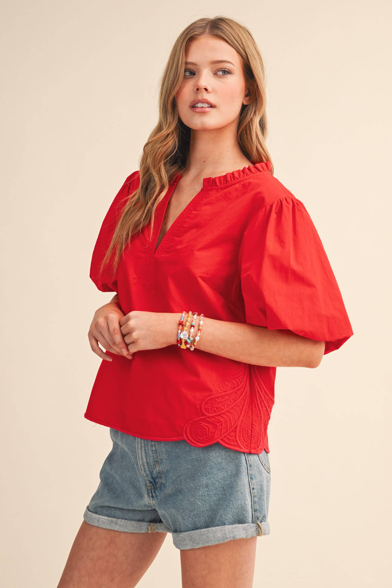 + Bubble sleeve top with side embroidery + Ruffled V neckline with seam detail + Bubble sleeves + Embroidery detail on side seams + Relaxed fit + Lined + Model is 5' 7" 30-24-34.5 and wears a S