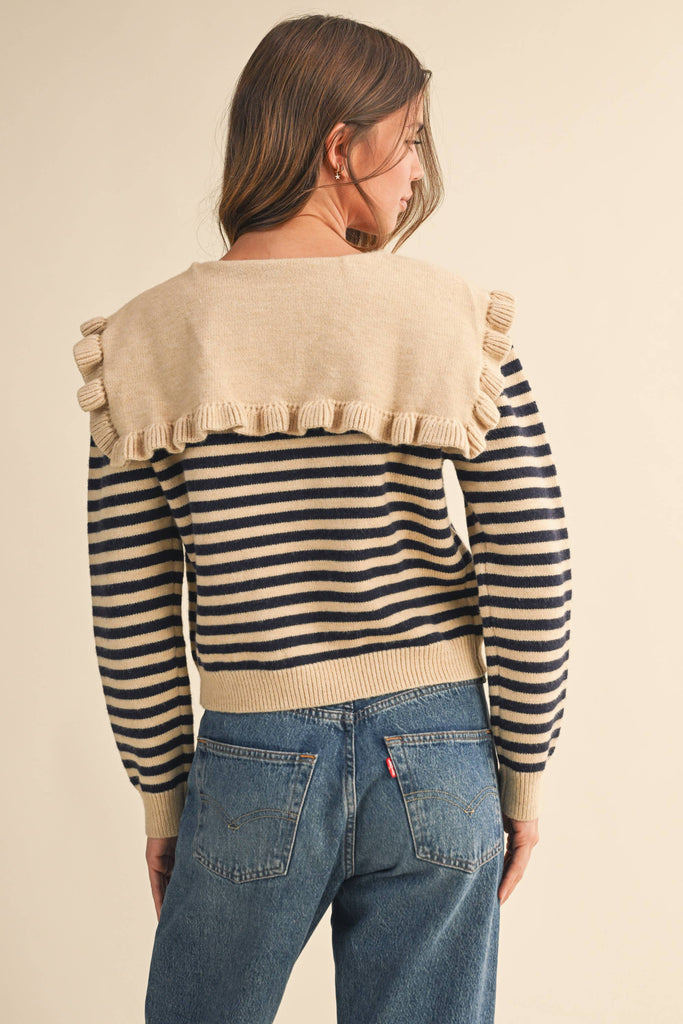 STRIPED LONG SLEEVE SWEATER CARDIGAN WITH RUFFLED COLLAR 52% ACRYLIC 28% NYLON 20% POLY