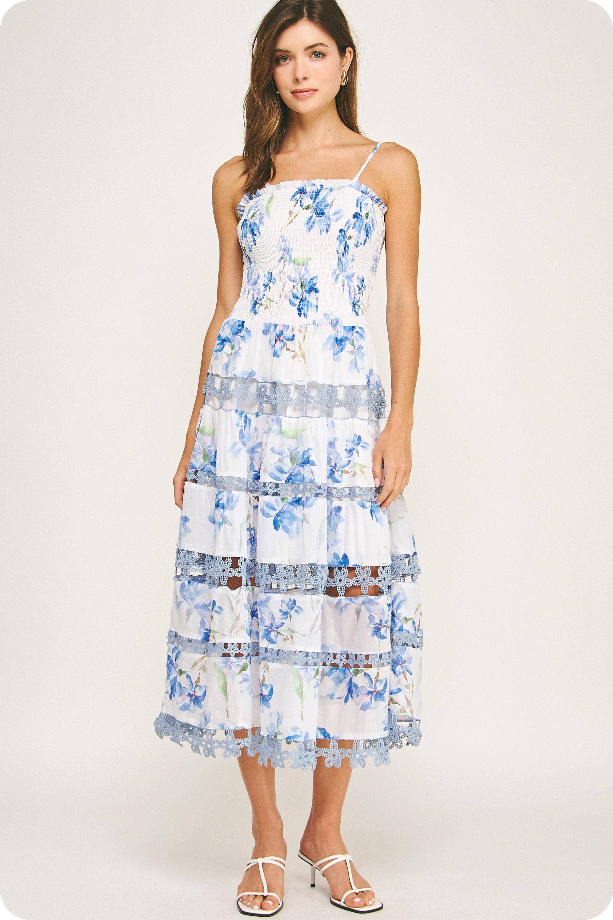 Studio Strut and Bolt Collection. Smocked lace trim sleeveless midi dress in an exclusive floral print on cotton voile fabric. This style features smocked bodice, removable adjustable straps, midi skirt, scalloped crochet lace trim at hem/skirt, and half lining for comfort.