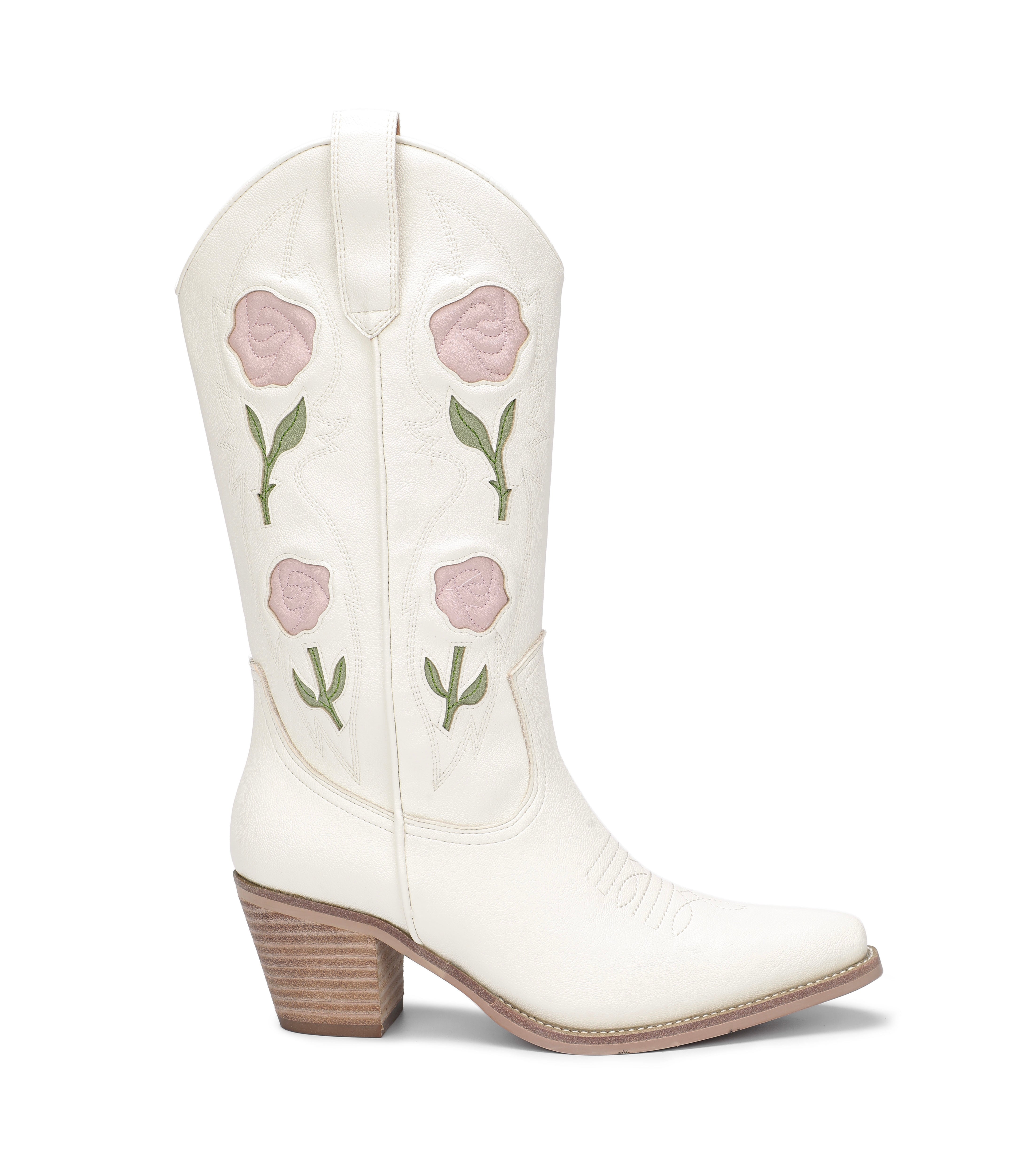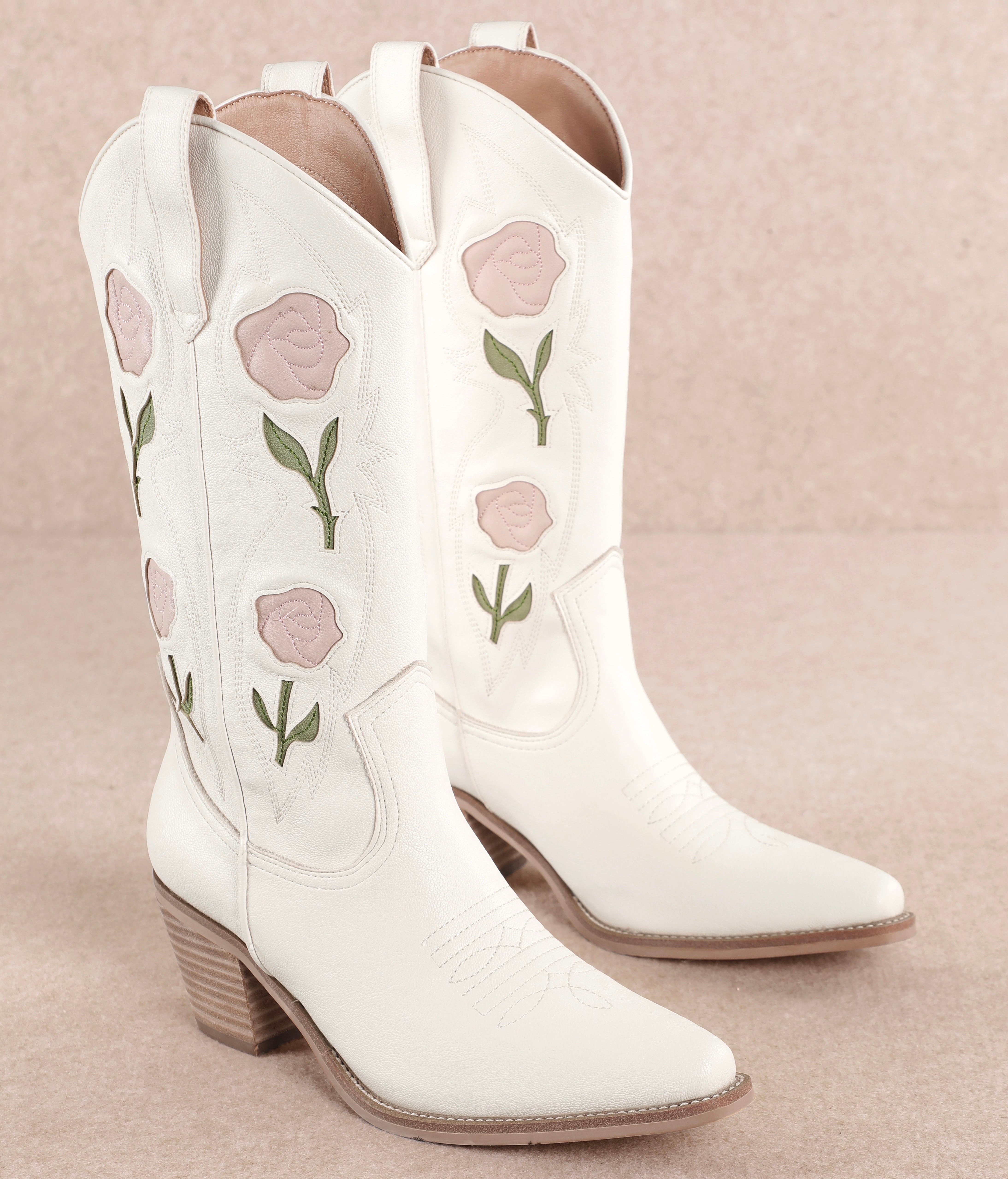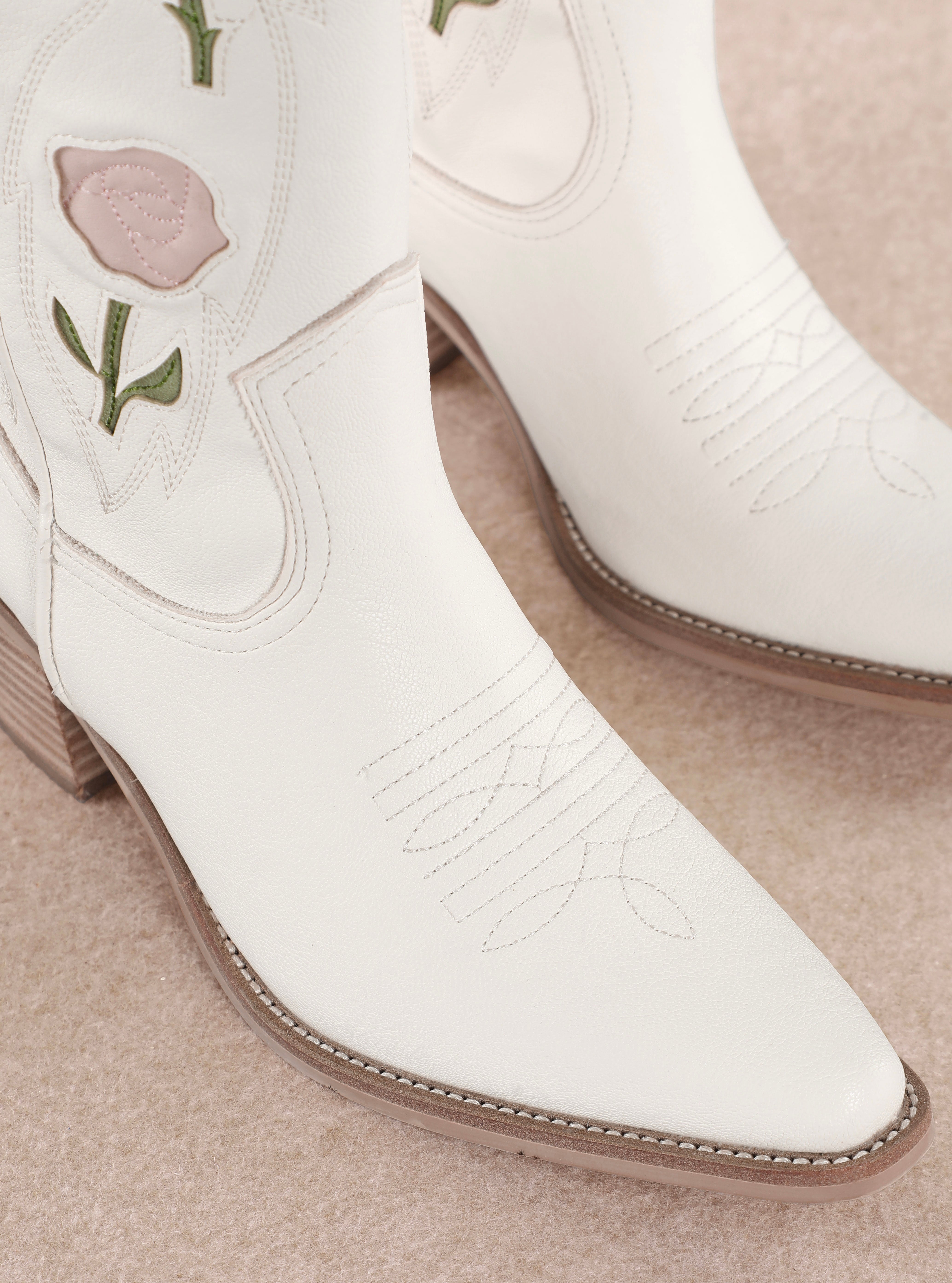 - Step into western romance with the Leni Rose-Embroidered Boot. Designed in crisp white leather, this standout style is adorned with blush pink rose details and delicate green stems for a soft, feminine twist on a classic cowboy silhouette. The pointed toe and stacked heel deliver timeless western flair, while the floral accents add playful elegance. Whether dressed up with skirts or paired with denim, Leni brings effortless charm to every outfit.