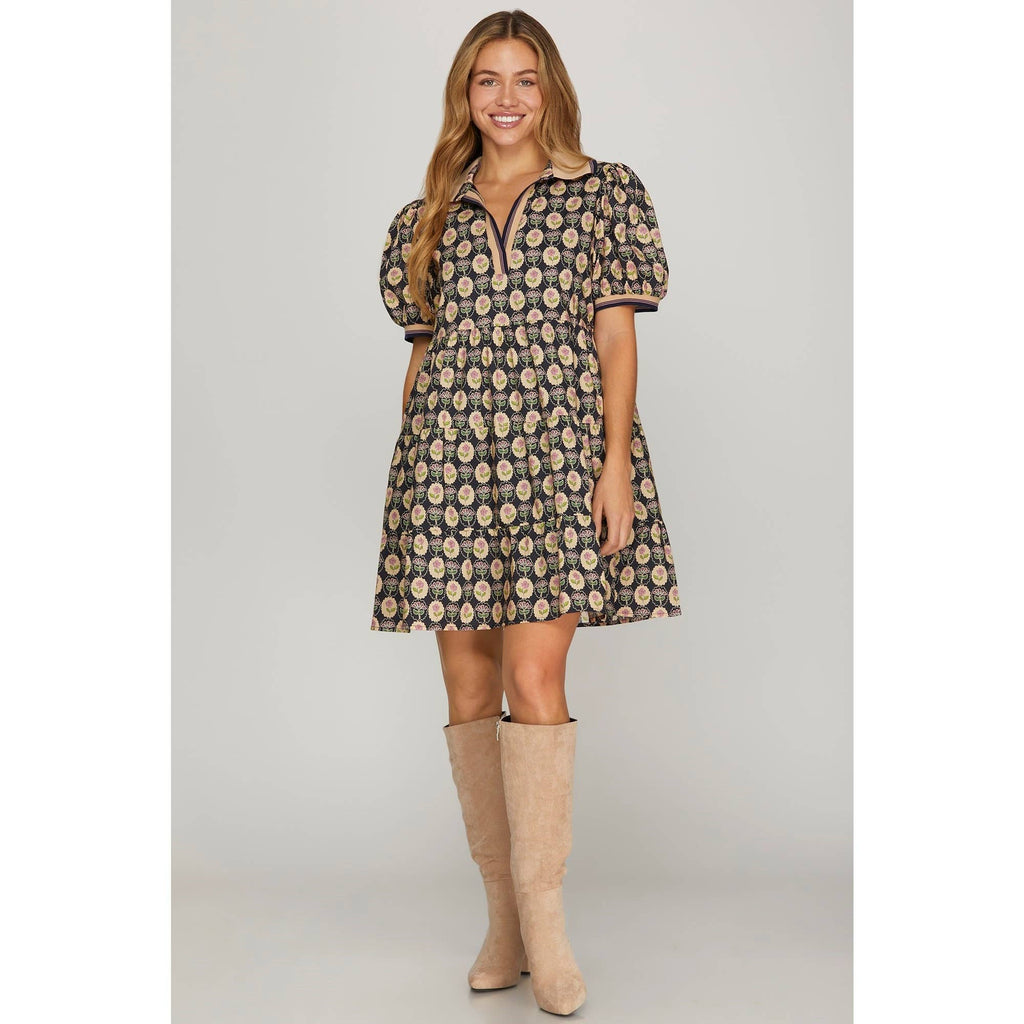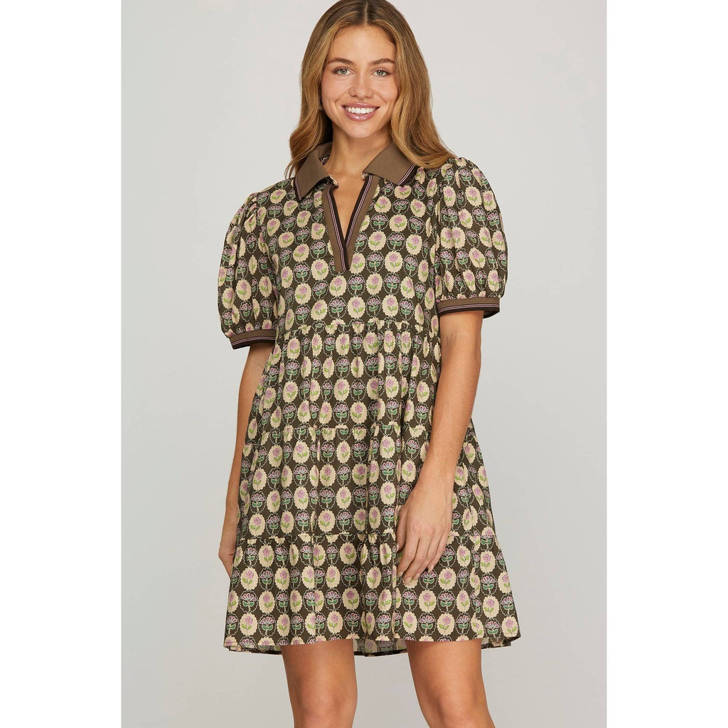 - PUFF SLEEVE PRINTED WOVEN TIERED MINI DRESS WITH RIB BAND COLLAR AND POCKETS