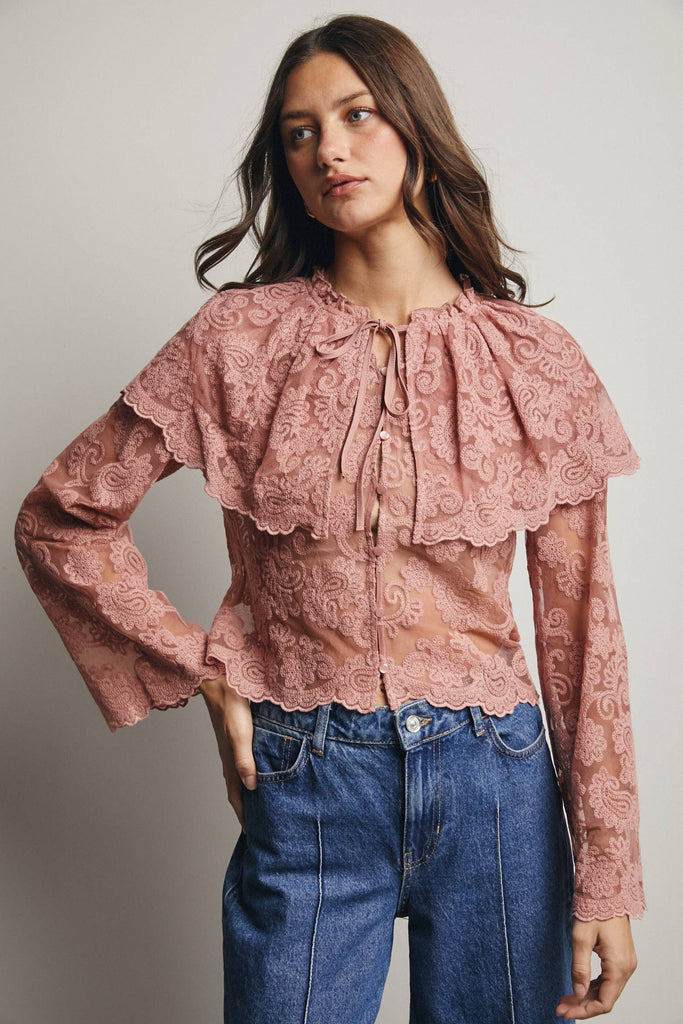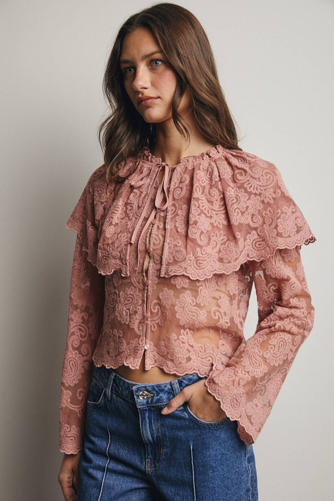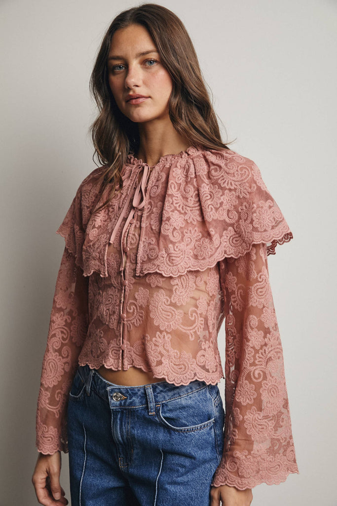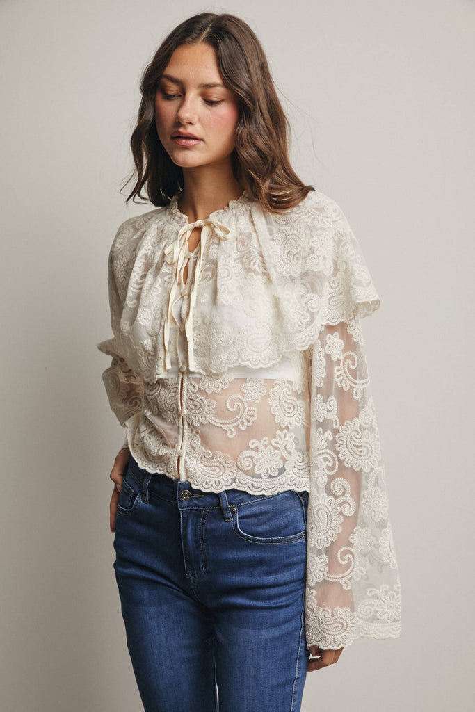 Whimsical yet wearable, this lace blouse is a standout top for any boho wardrobe-perfect for pairing with denim, maxi skirts, or layered into sets that lean into soft femininity.