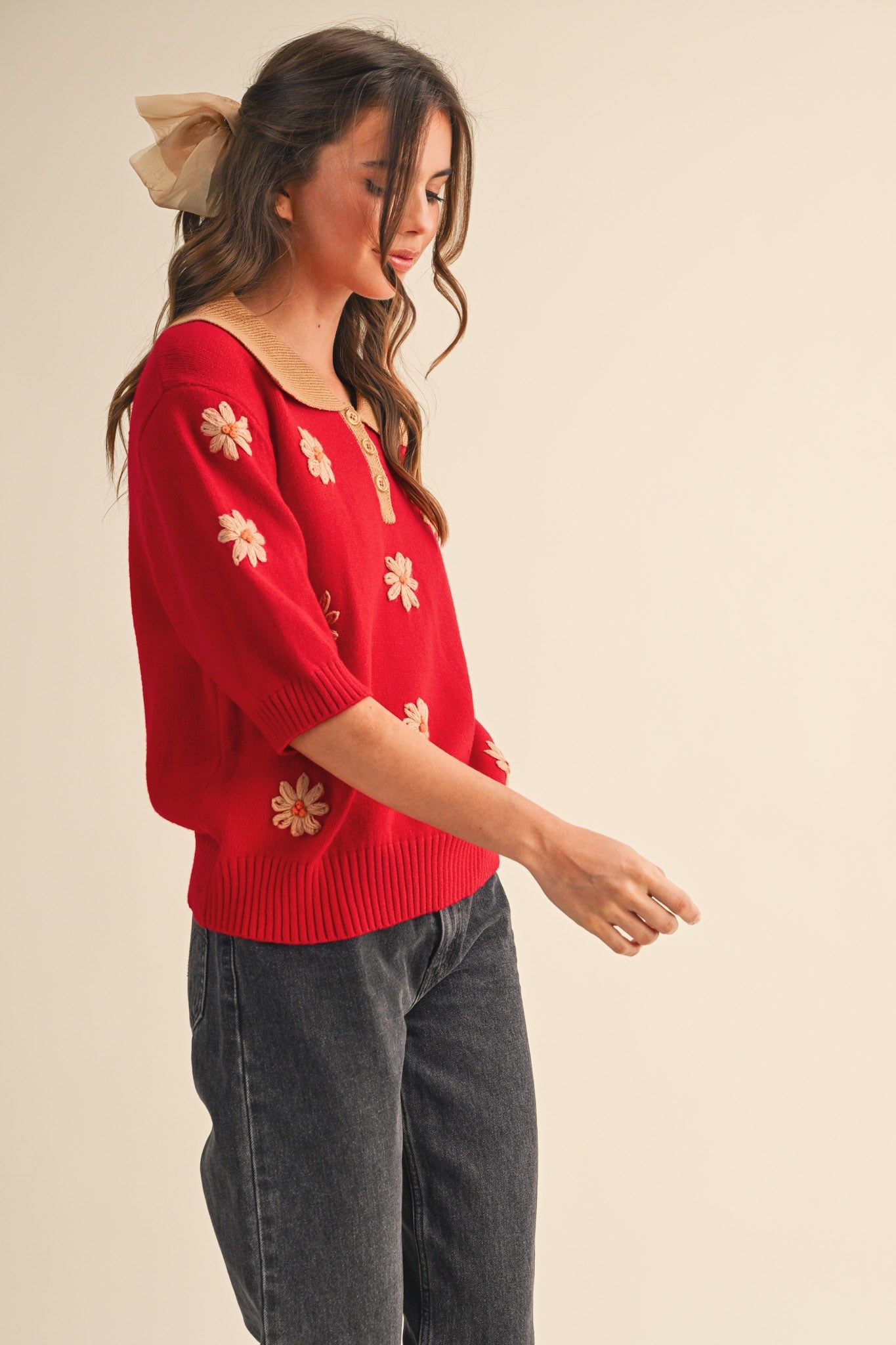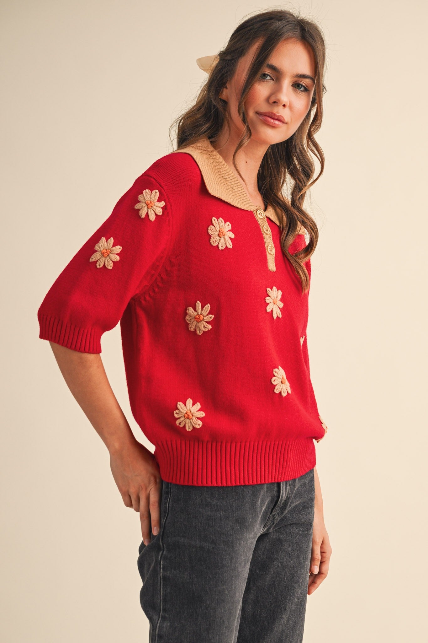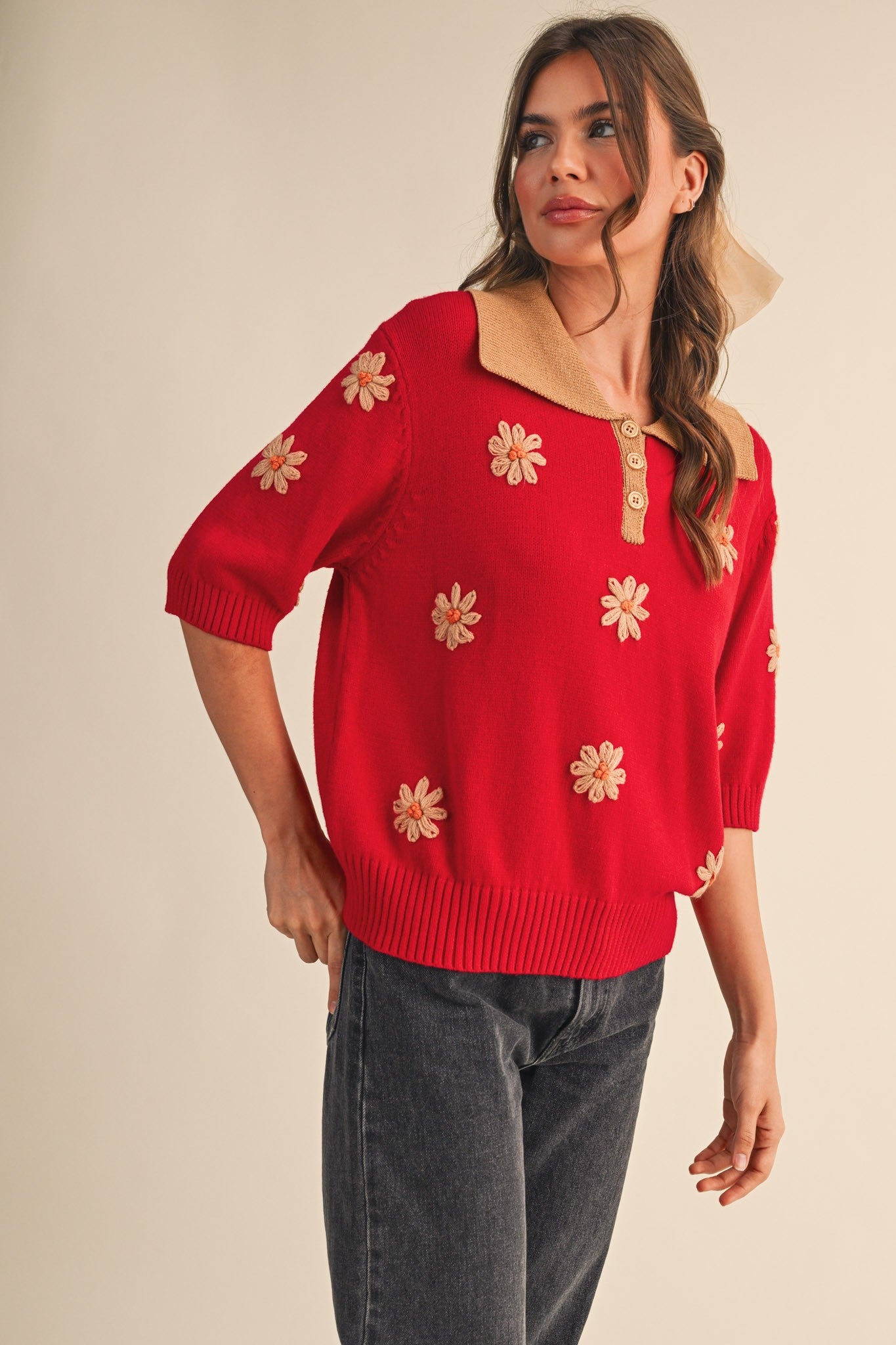 + Floral hand-stitched embroidery short sleeve sweater + Hand-stitched floral embroidery + Collared neckline + Button down placket + Elbow length sleeves + Ribbed cuffs and hem + Waist-length fit + Model is 5' 10.5" 32-24-36 and wears a S