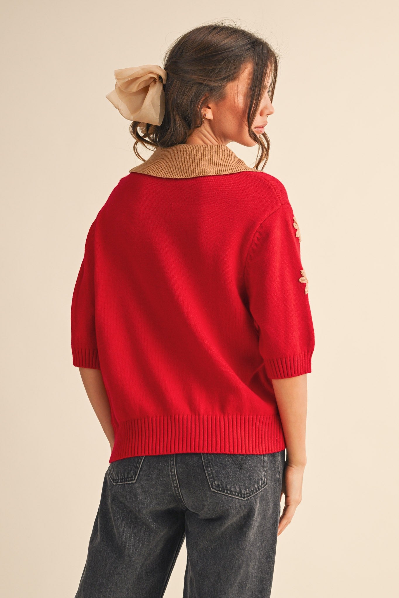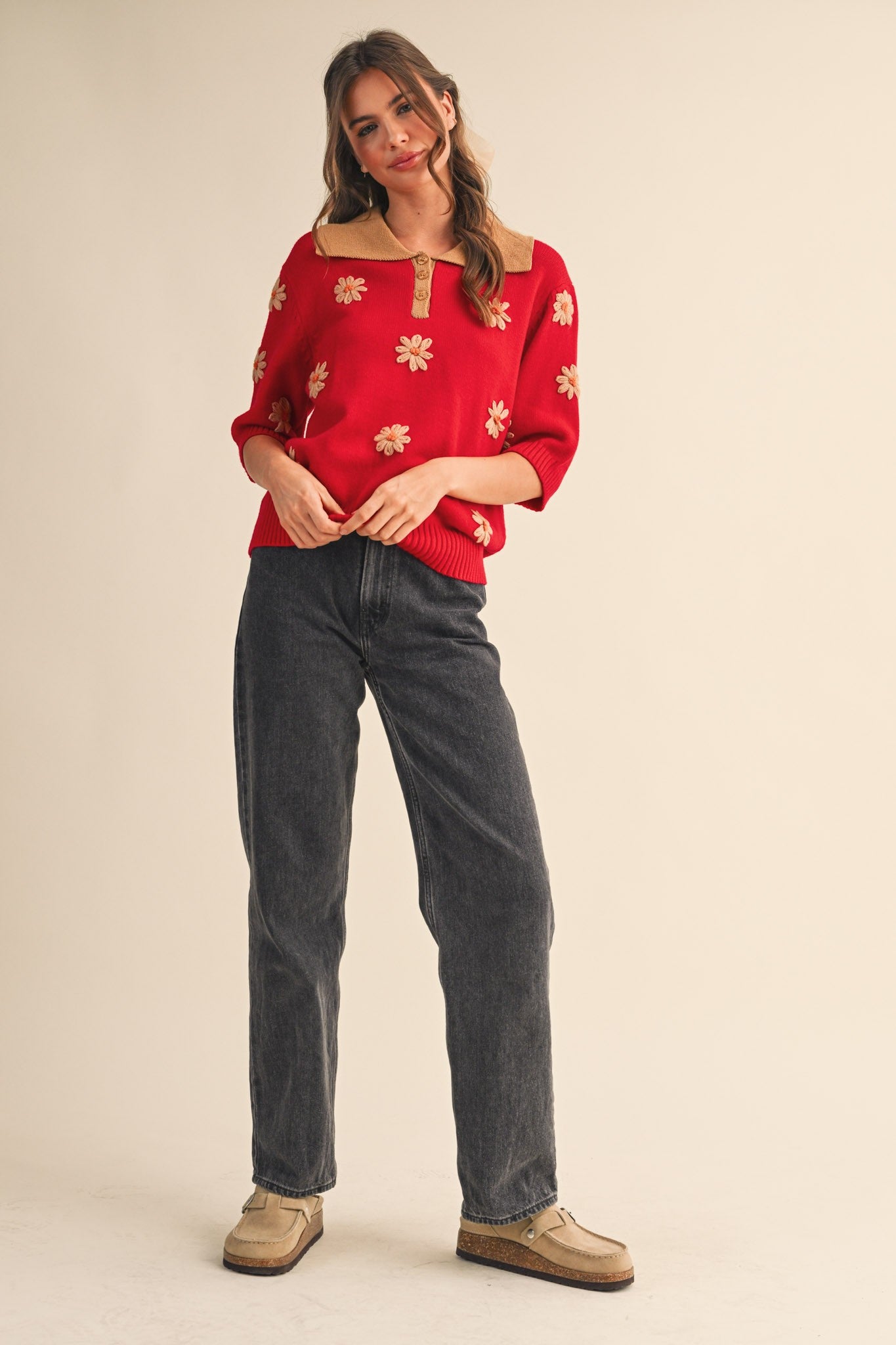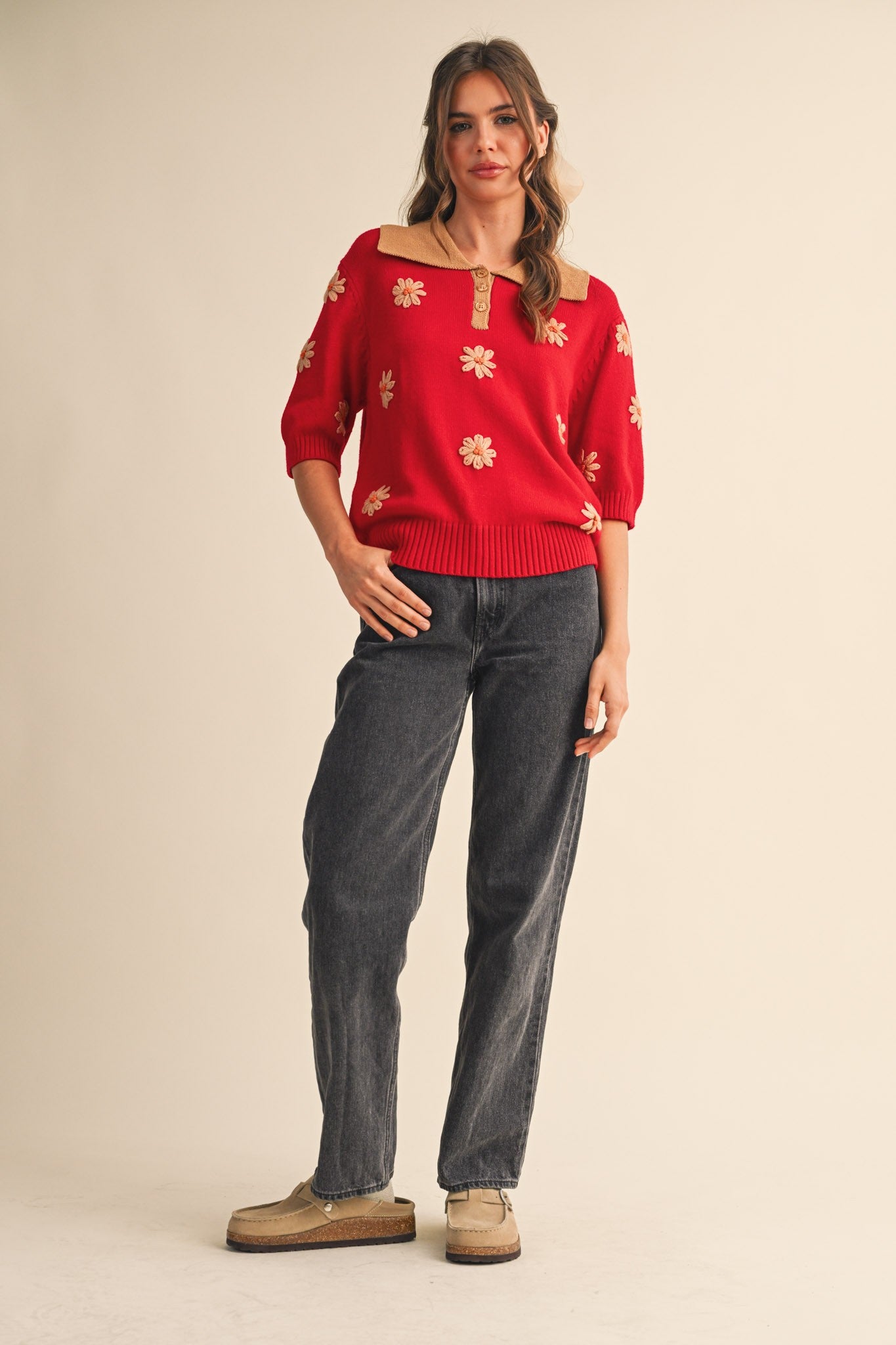 + Floral hand-stitched embroidery short sleeve sweater + Hand-stitched floral embroidery + Collared neckline + Button down placket + Elbow length sleeves + Ribbed cuffs and hem + Waist-length fit + Model is 5' 10.5" 32-24-36 and wears a S