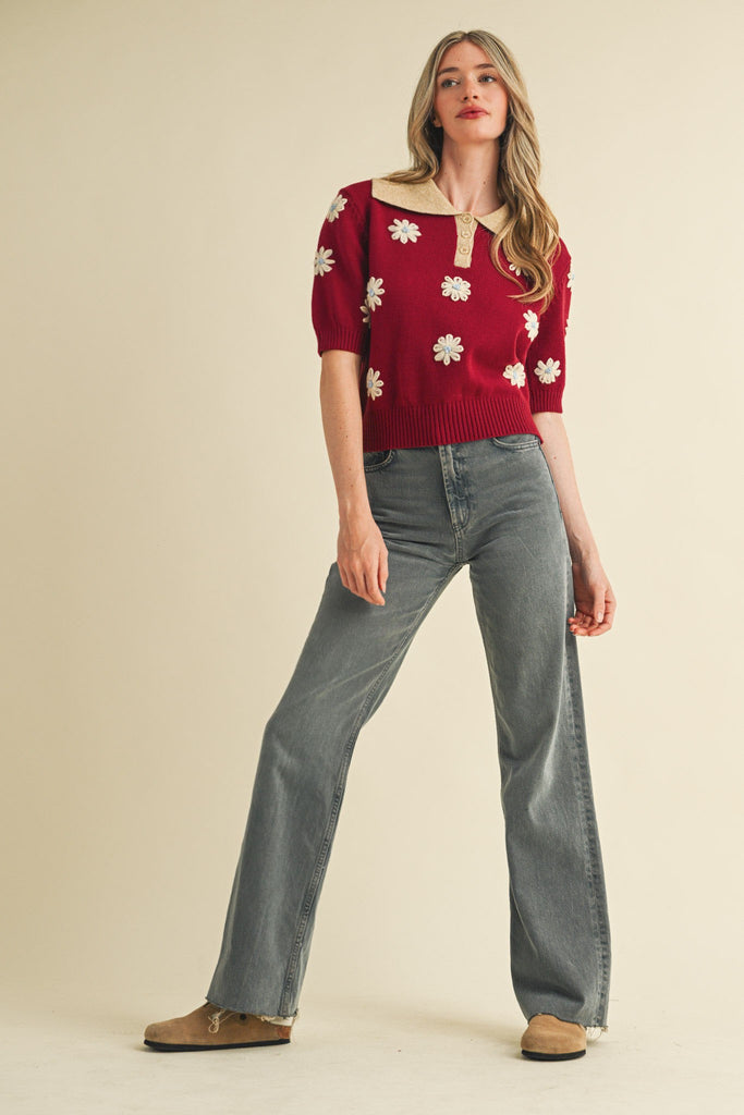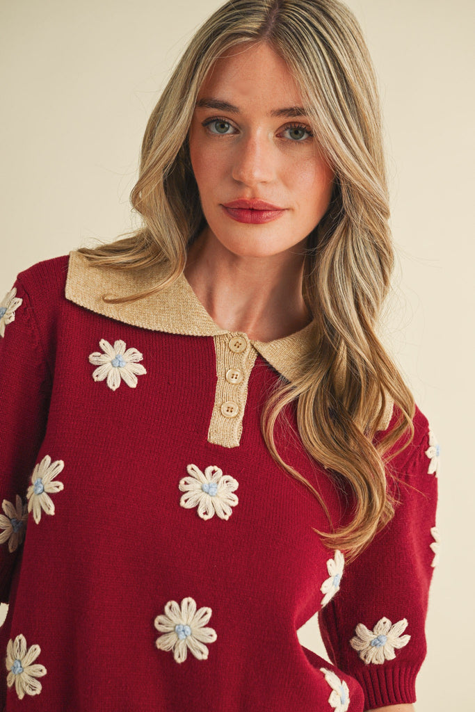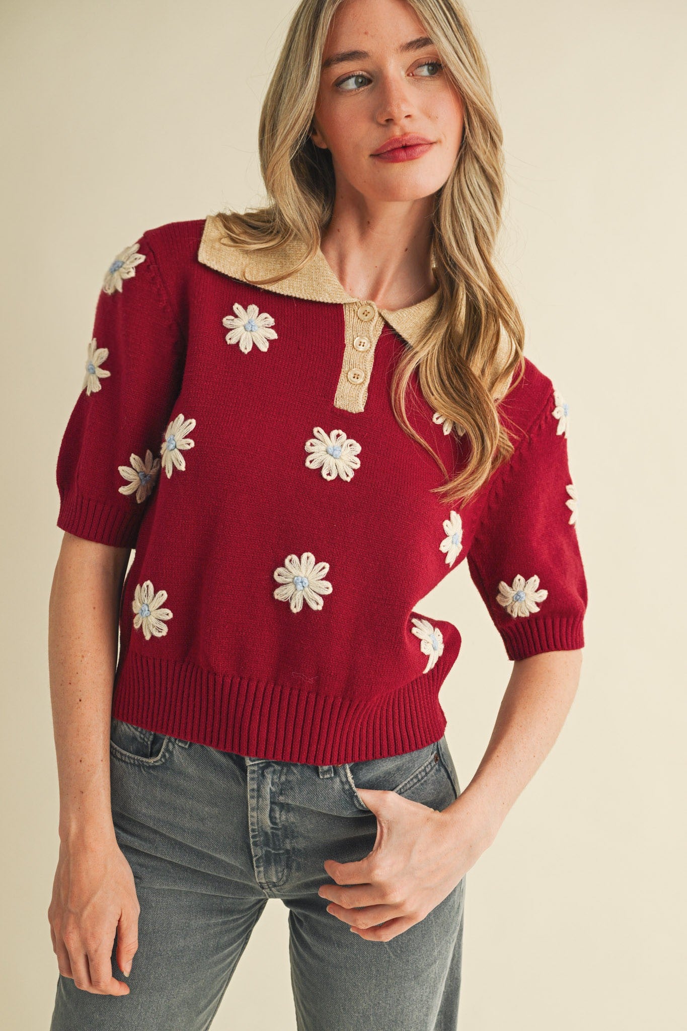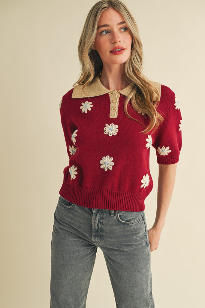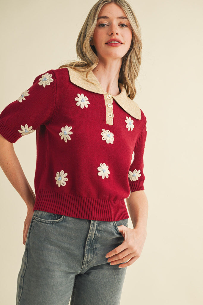 + Floral hand-stitched embroidery short sleeve sweater + Hand-stitched floral embroidery + Collared neckline + Button down placket + Elbow length sleeves + Ribbed cuffs and hem + Waist-length fit + Model is 5' 10.5" 32-24-36 and wears a S