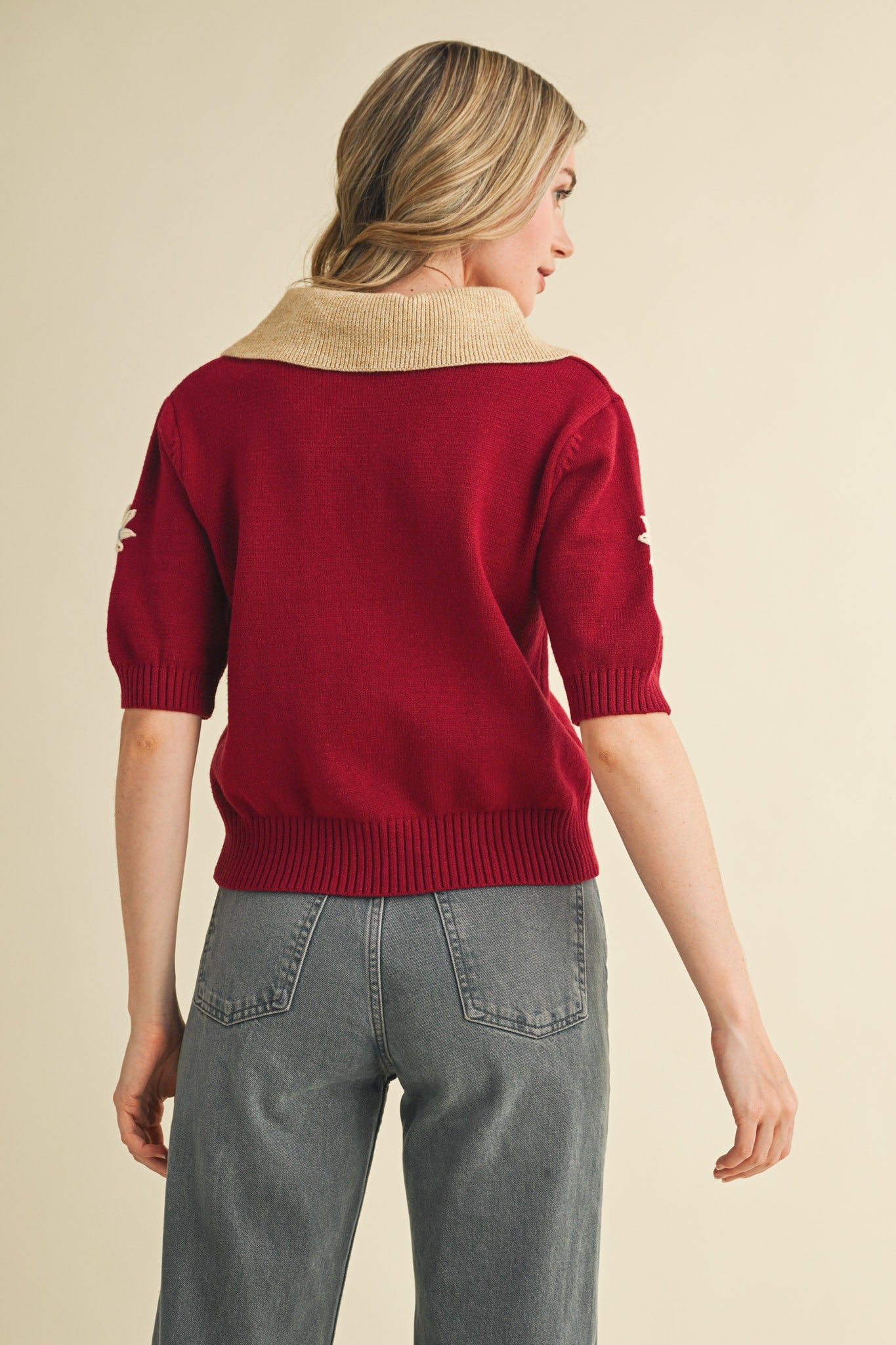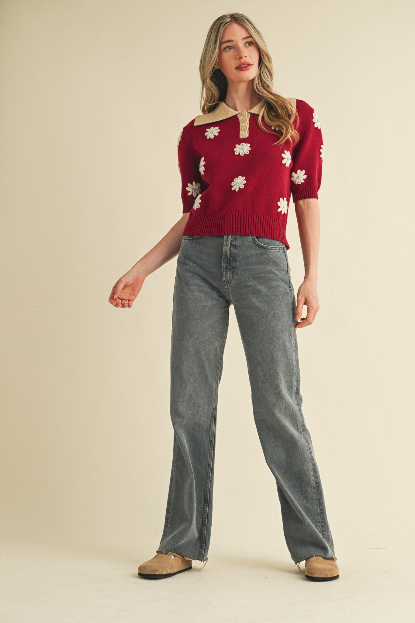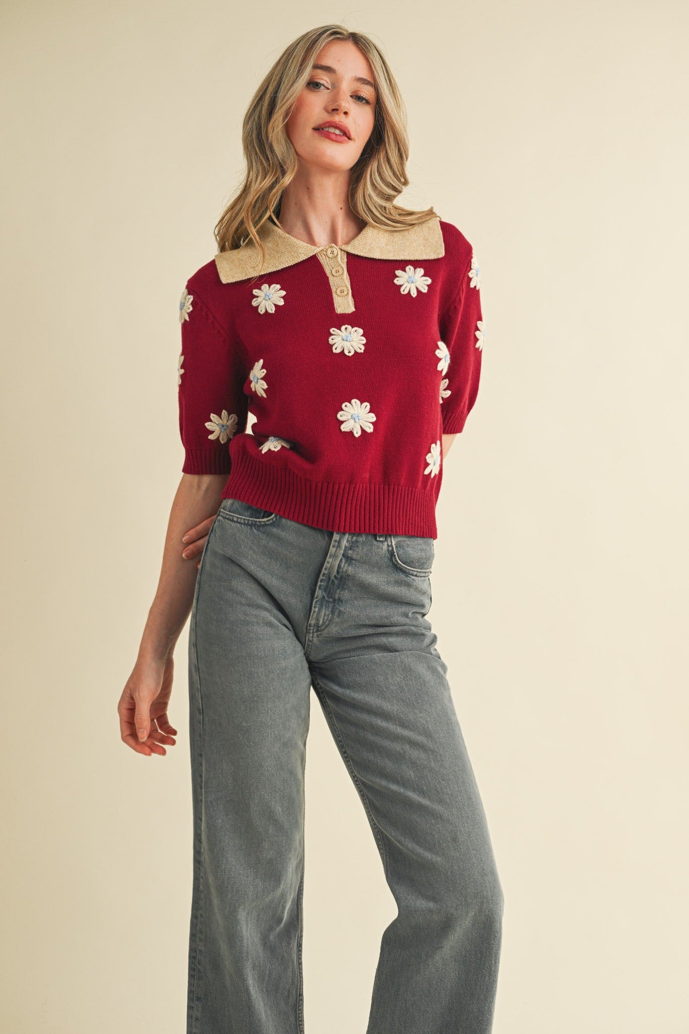 + Floral hand-stitched embroidery short sleeve sweater + Hand-stitched floral embroidery + Collared neckline + Button down placket + Elbow length sleeves + Ribbed cuffs and hem + Waist-length fit + Model is 5' 10.5" 32-24-36 and wears a S