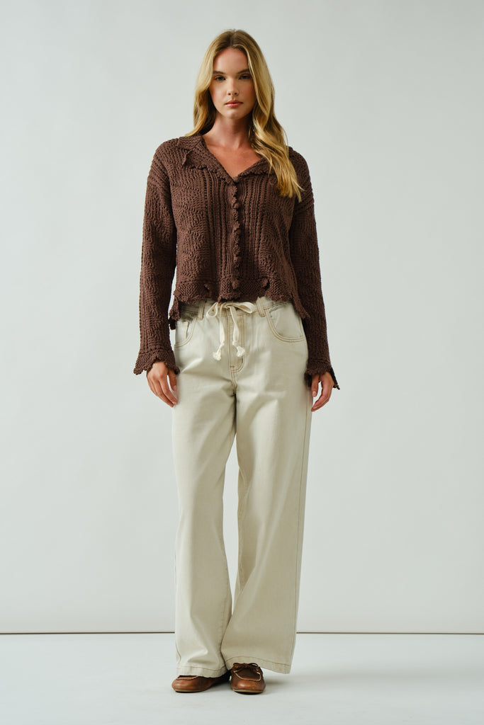 - This timeless open knit crochet cardigan, crafted in a delicate geometric pattern for a breezy, feminine feel. Featuring a scalloped hem, textured pom-pom button closures, and a soft collar. -Open knit crochet -Scallop hem -Collared