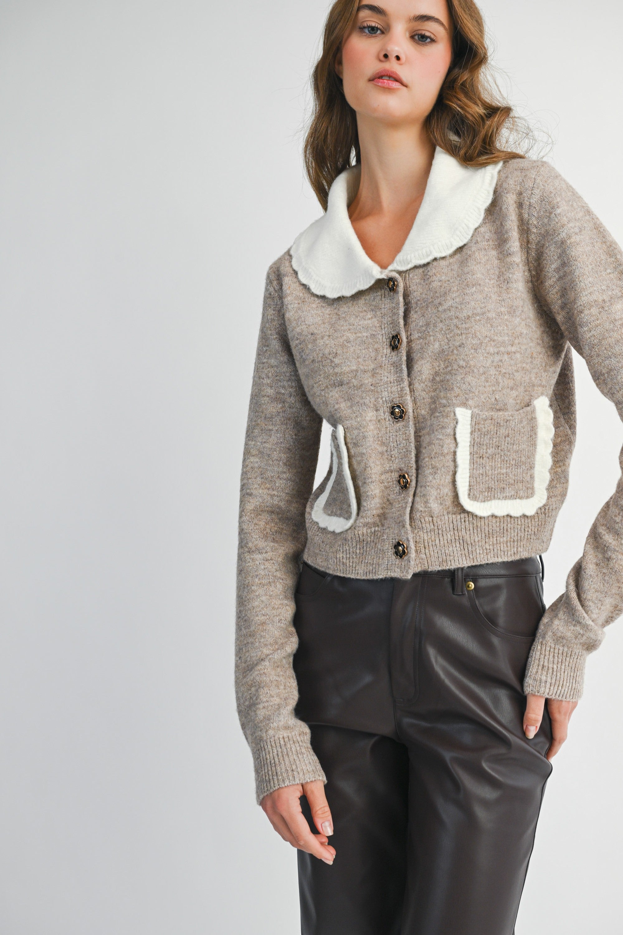 Knit cardigan with contrast peter pan collar, flower buttons, front contrast scallop patch pockets.