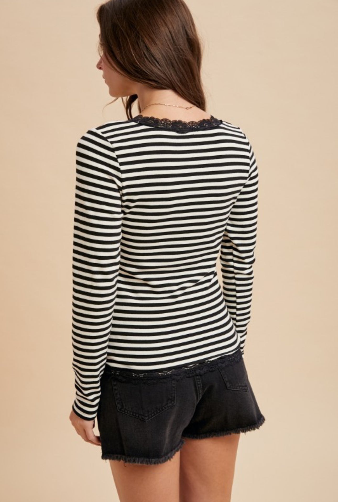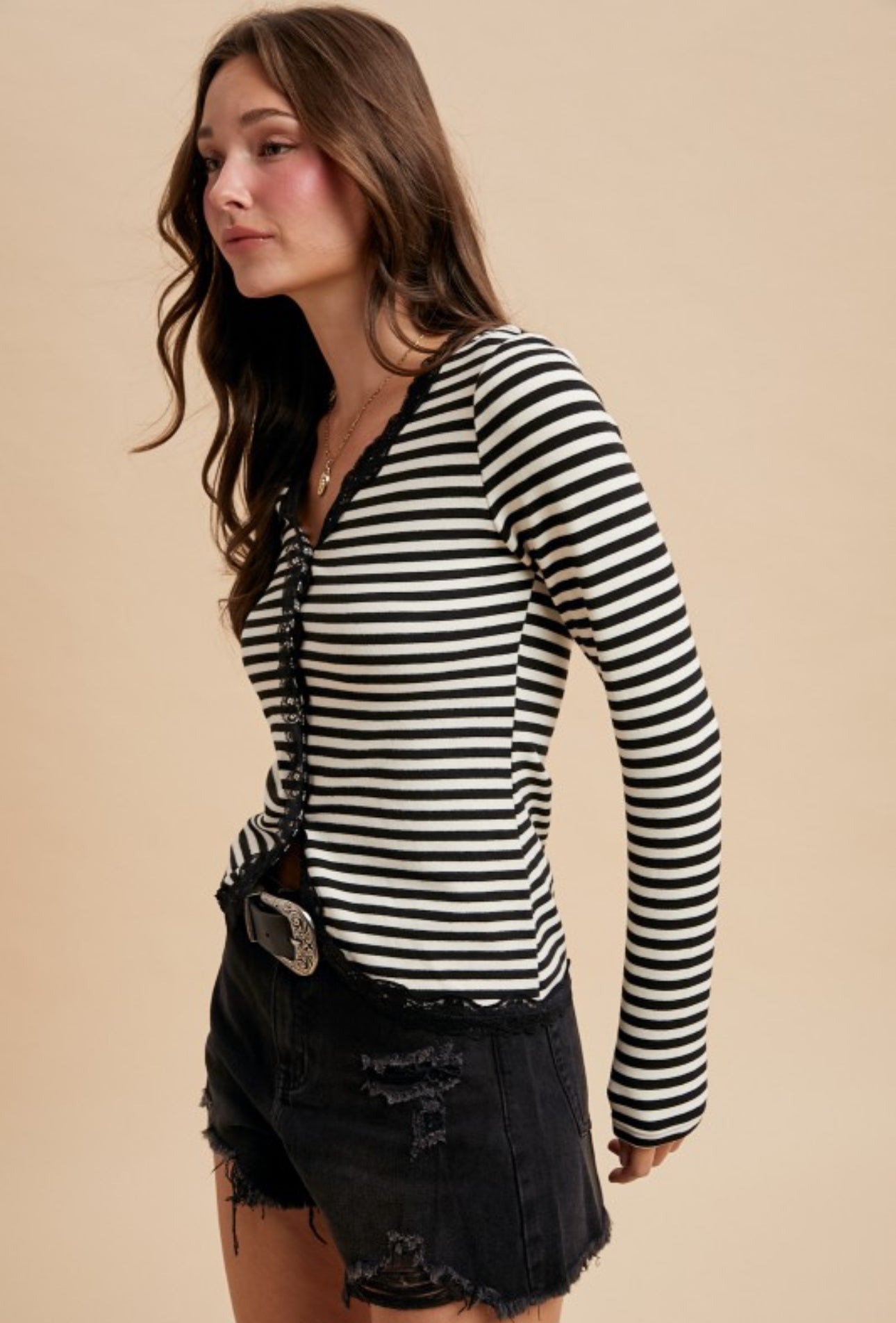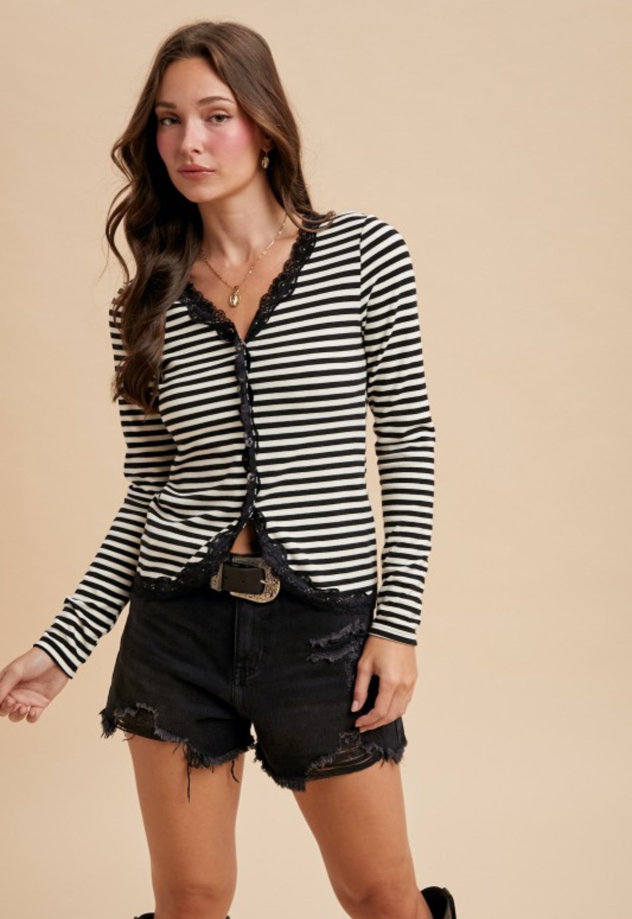 This lace-trimmed striped cardigan is the perfect blend of feminine detail and everyday comfort. Designed with contrast lace trim and a soft brushed rib knit fabric, it features a flattering button-down front and a relaxed fit that’s easy to style year-round.