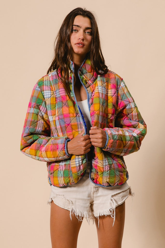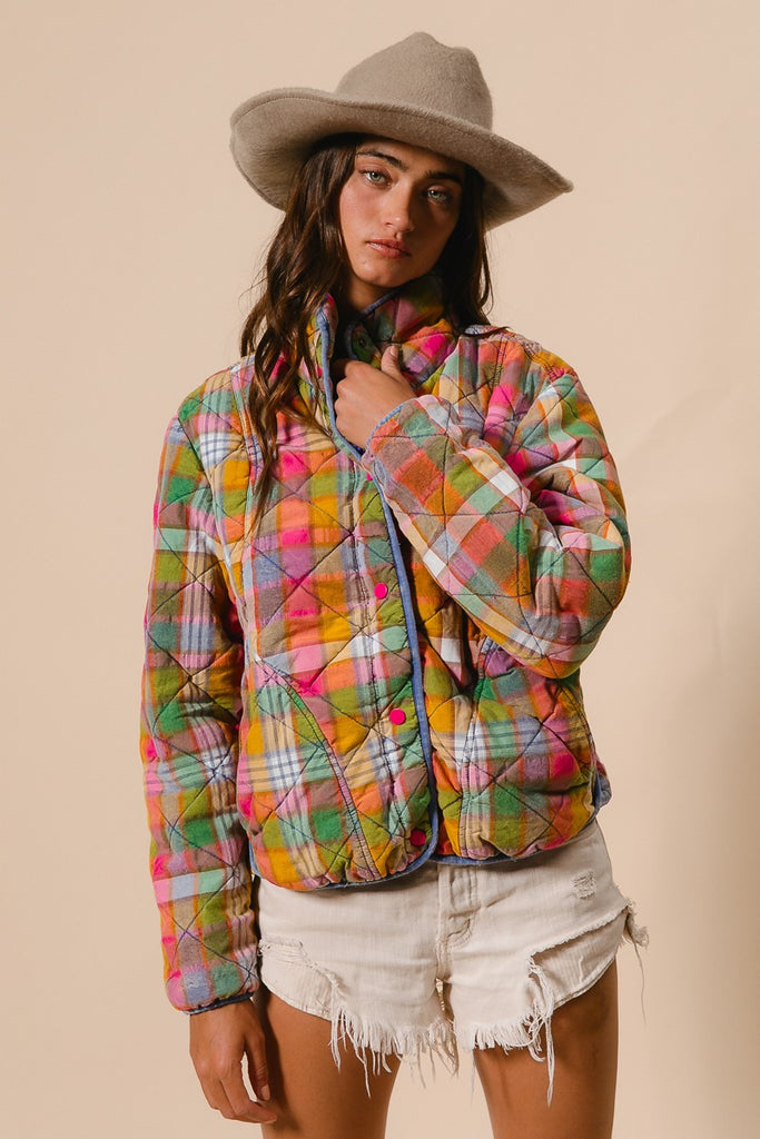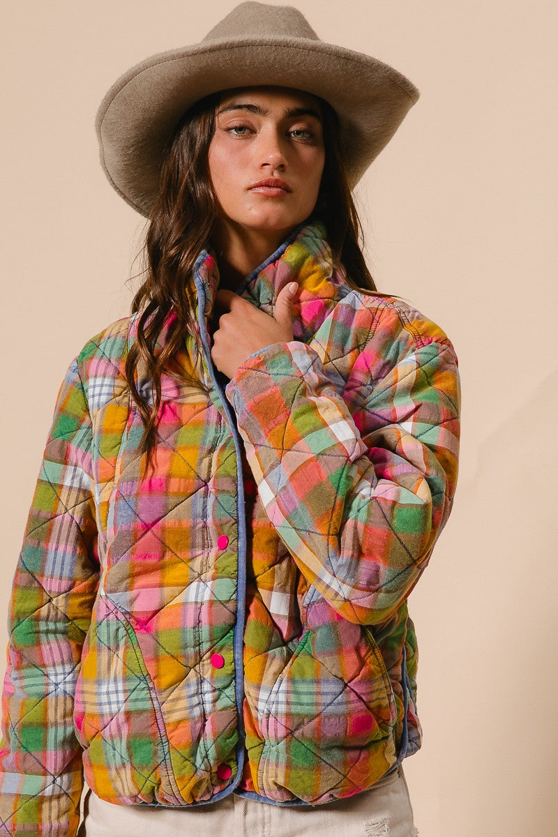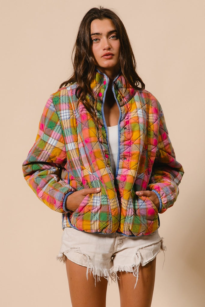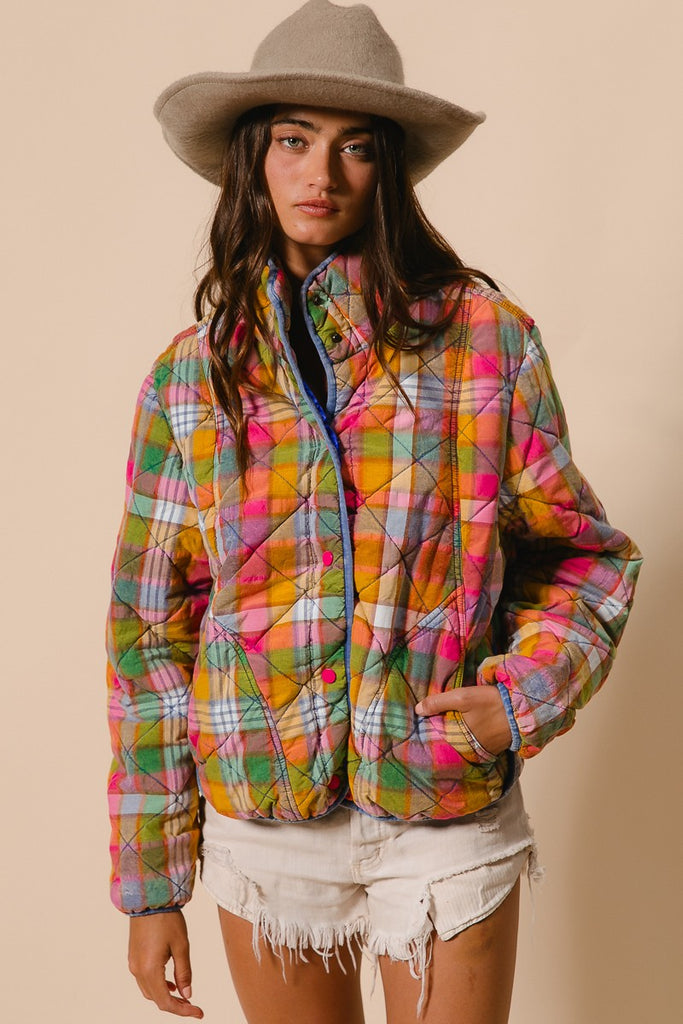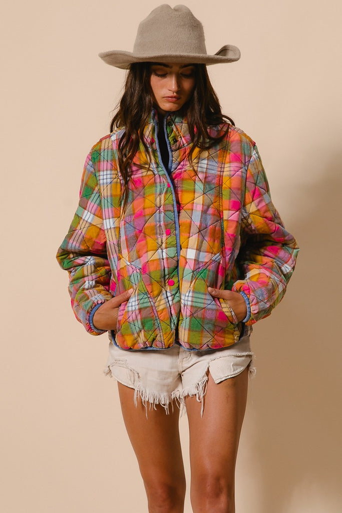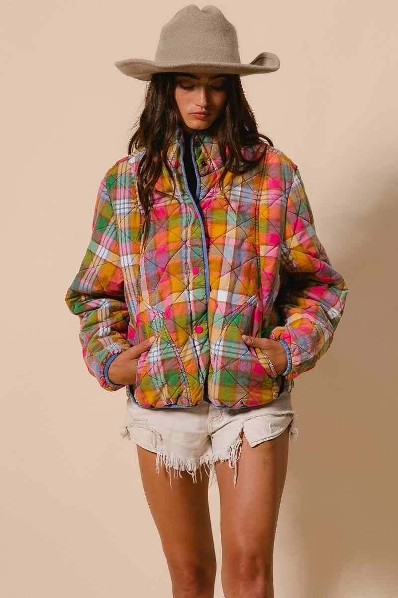 BLEACHED VINTAGE PLAID QUILTED JACKET WITH POCKETS