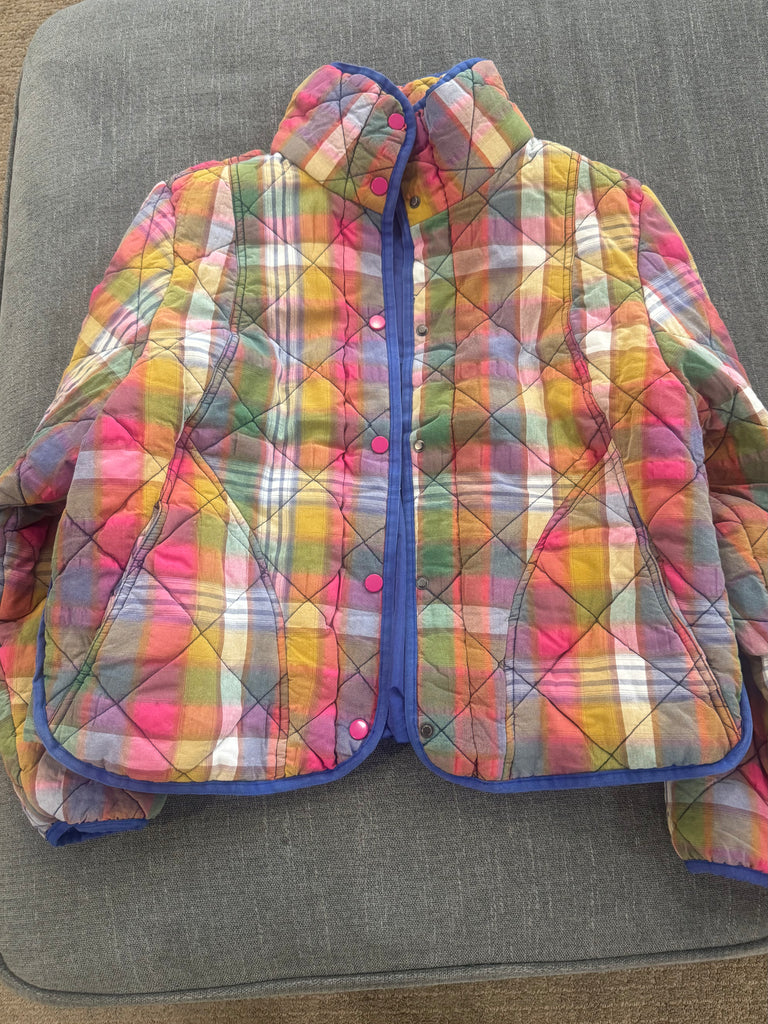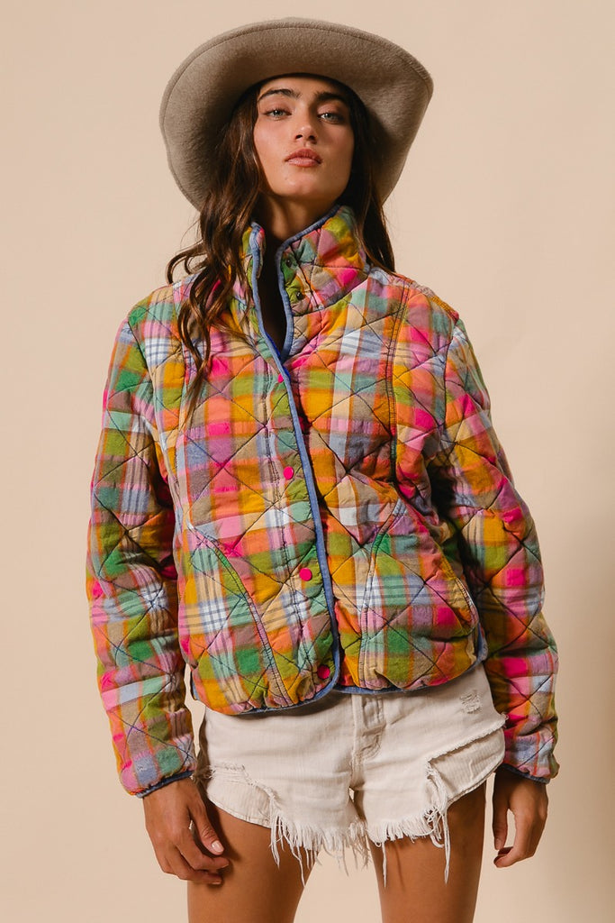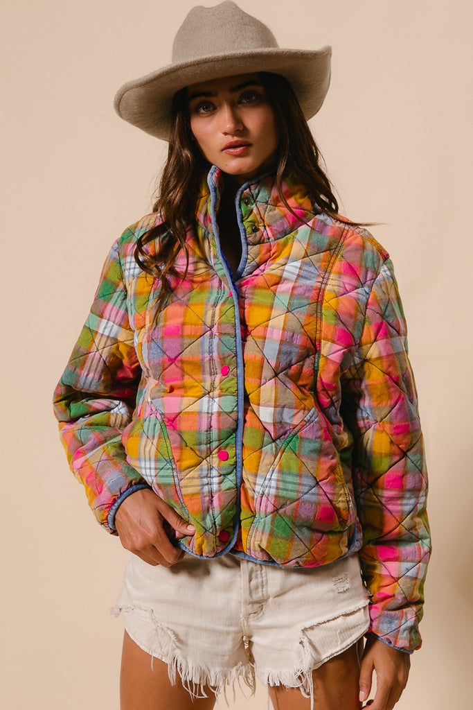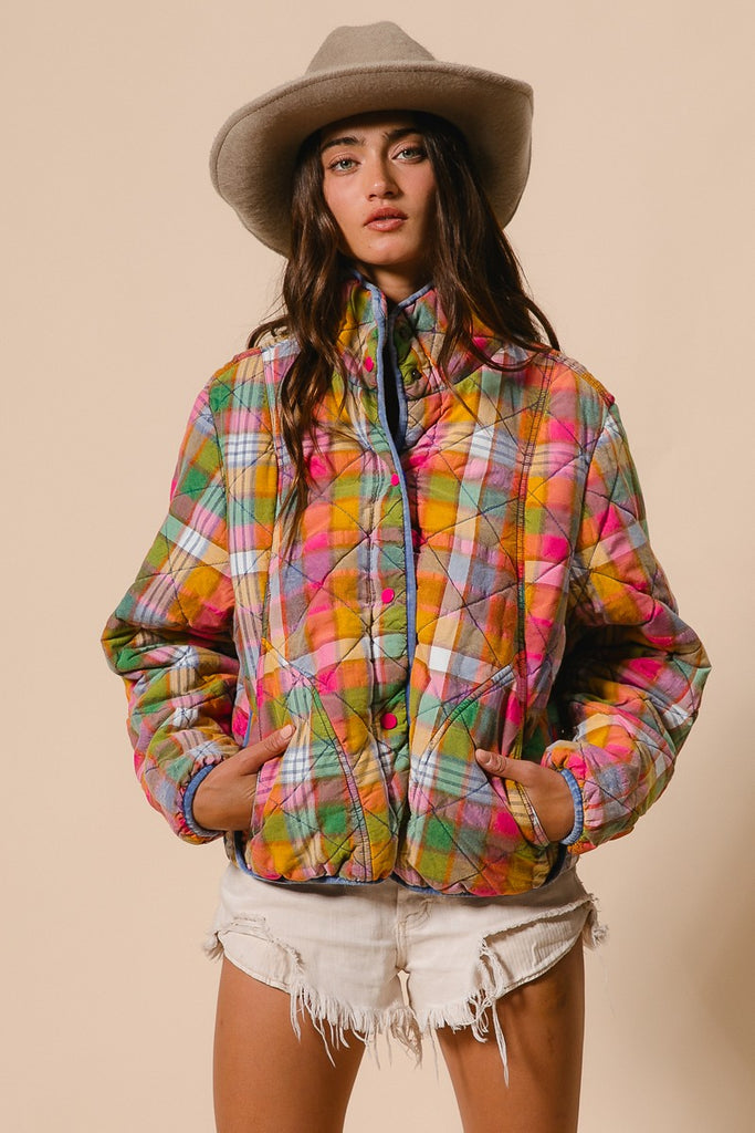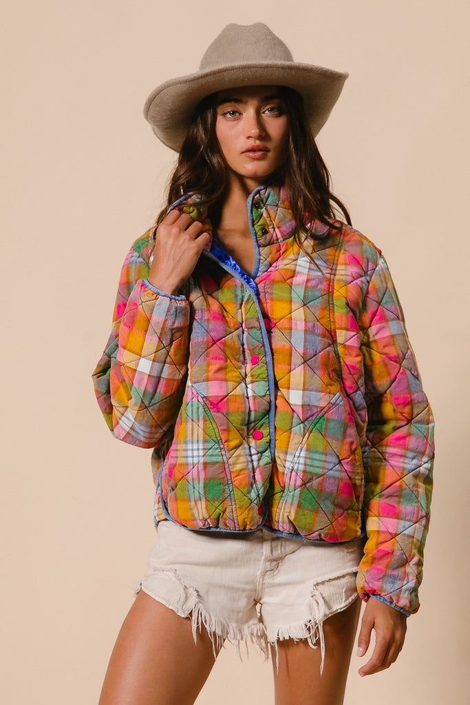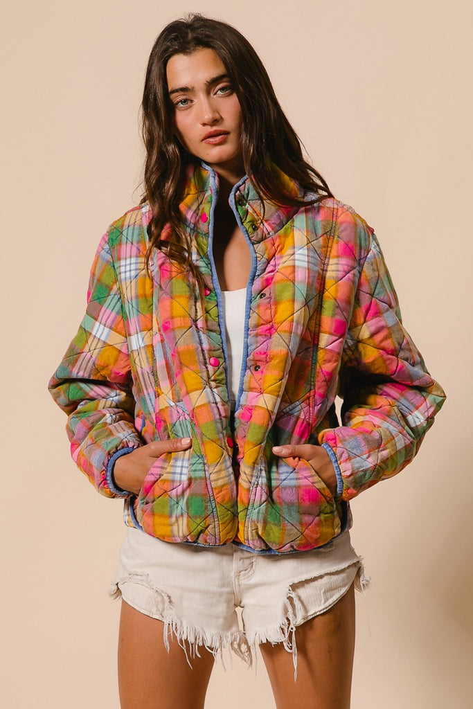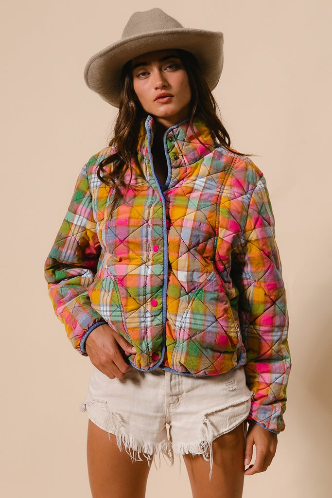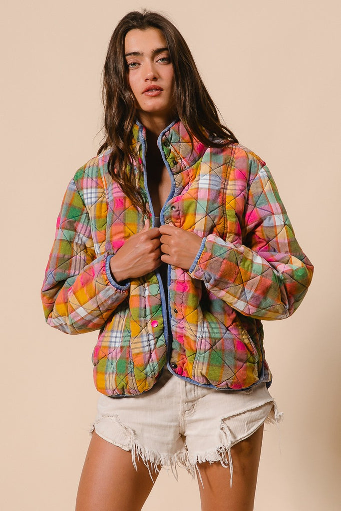 BLEACHED VINTAGE PLAID QUILTED JACKET WITH POCKETS
