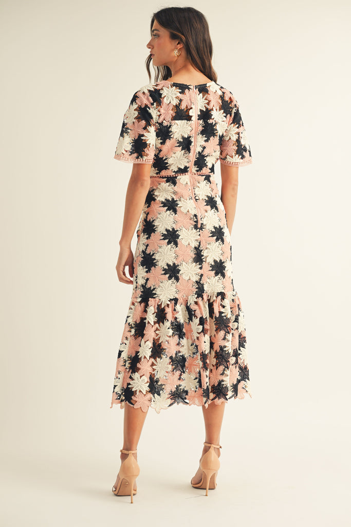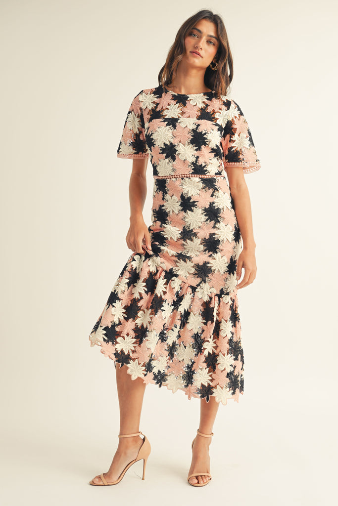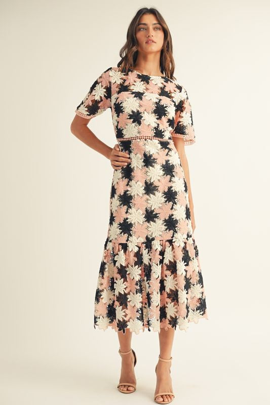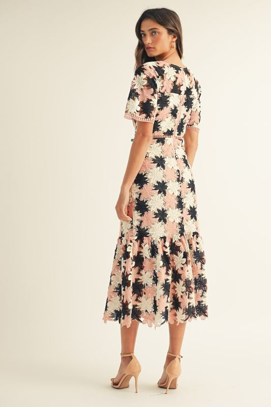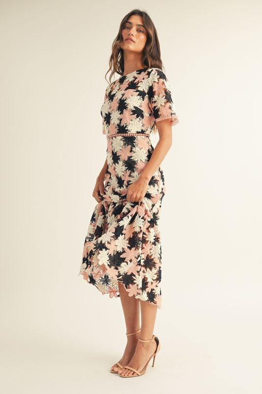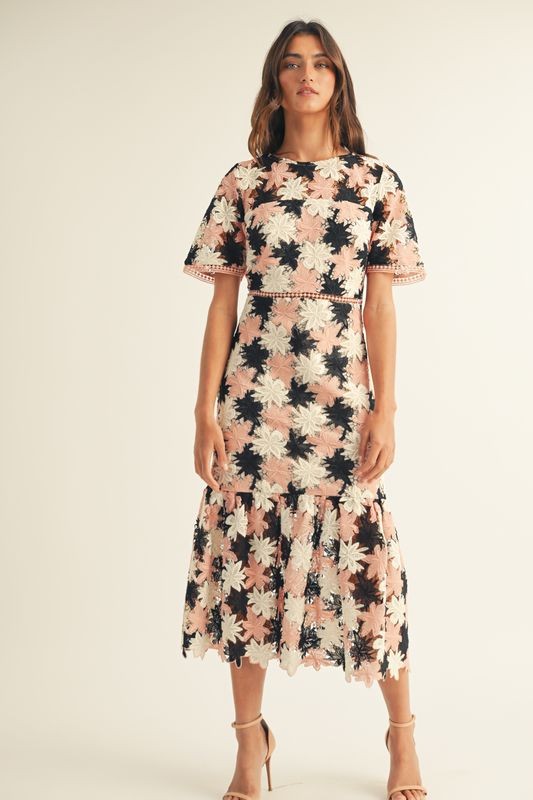 FLORAL CROCHET SHORT SLV RUFFLE BOTTOM MAXI DRESS