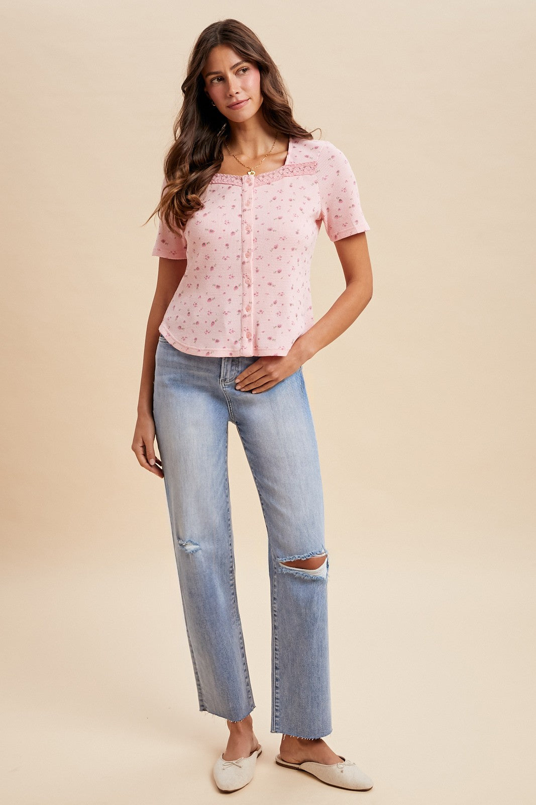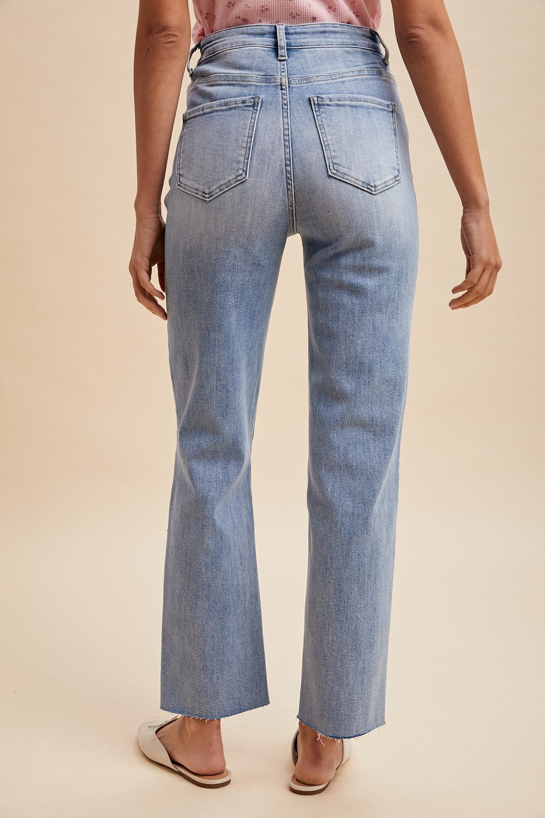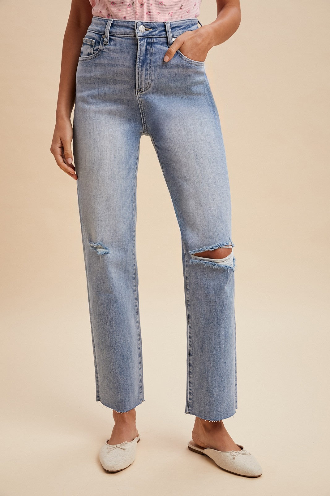 KNEE DISTRESSED DETAIL STRAIGHT LEG DENIM JEAN - VINTAGE WASHED - COMFORT STRETCH - HIGH RISE - KNEE DISTRESSED DETAIL - RAW CUT FINISH HEM - ZIP FLY FRONT WITH BUTTON - CROPPED LENGTH