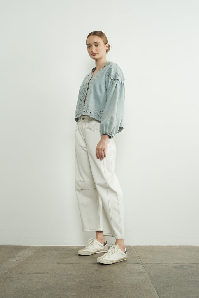 • This light-wash denim blouse features intricate floral embroidery and delicate cutouts, adding a feminine touch to its relaxed silhouette. The V-neckline and button-down front create a classic look, while the balloon sleeves with elastic cuffs provide a trendy and comfortable fit Model size Model is wearing size S Height - 5'10" / 178 cm 34(Bust) - 25(Waist) - 35(Hips)