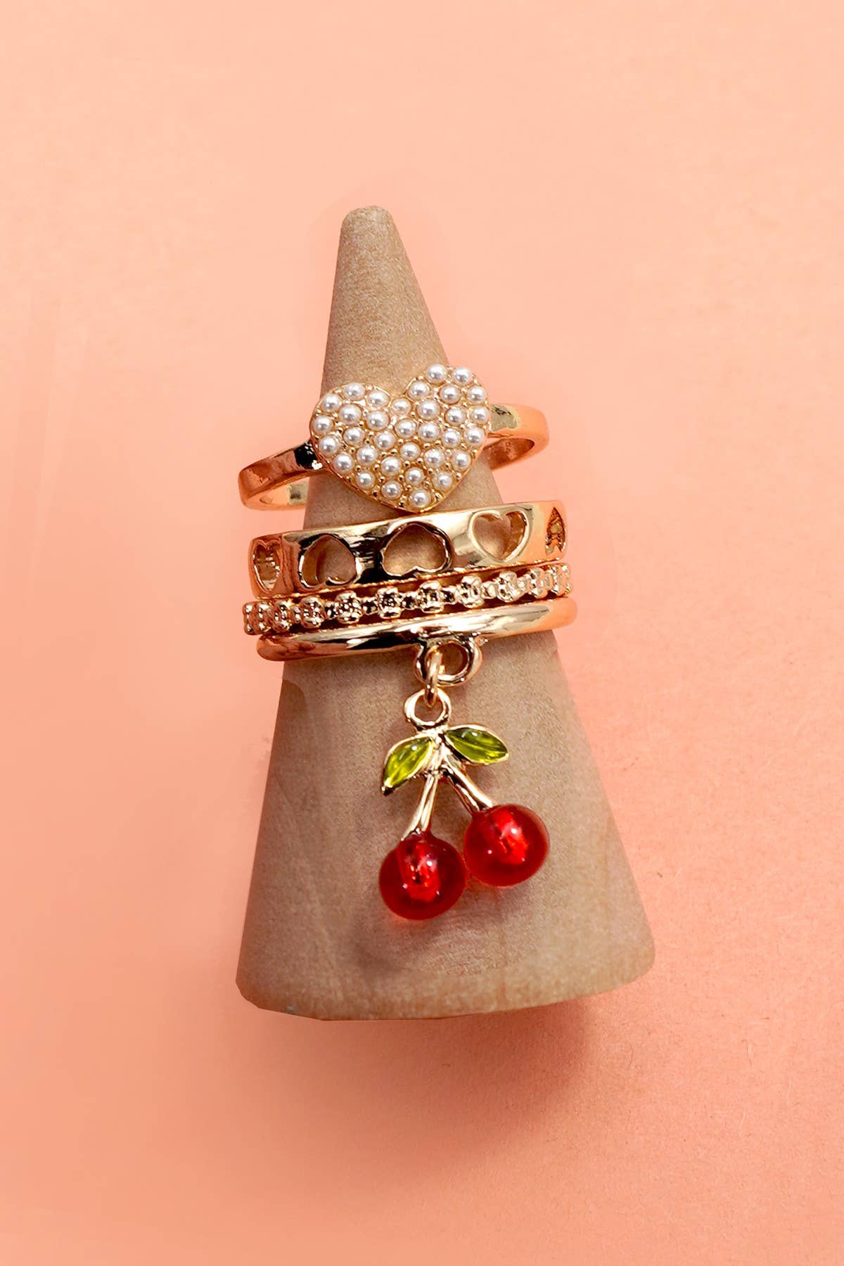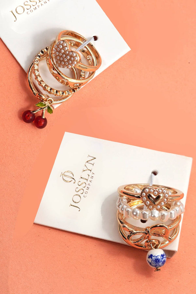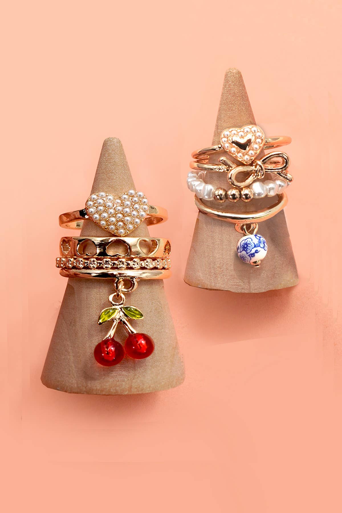 Layered Multi Cherry Porcelain Bow Stackable Ring Set, featuring a mix of different style, delicate bow, cherry, porcelain ,heart, floral accents, these rings can be worn together for a bold, stacked look or styled individually for a subtle pop.