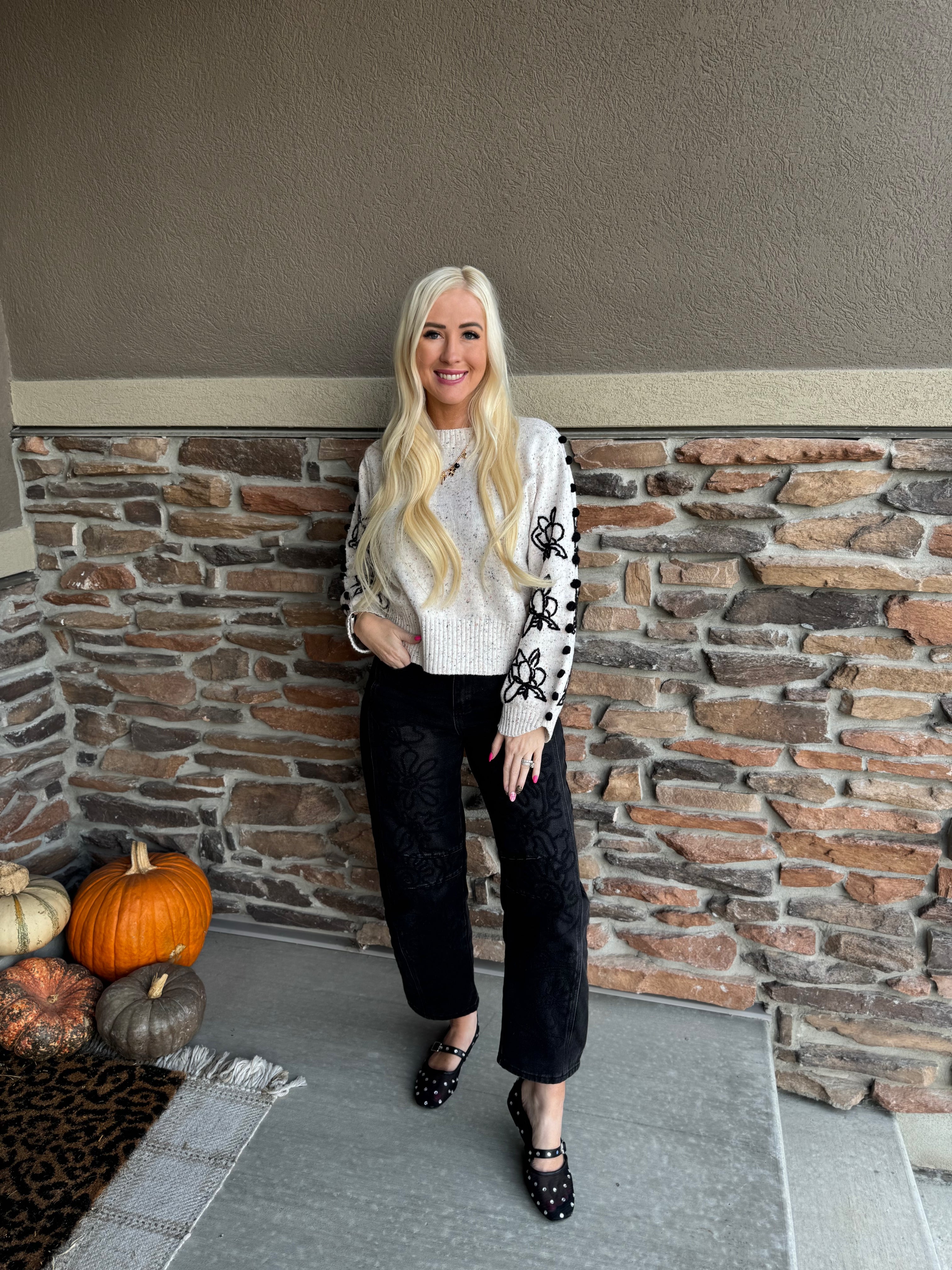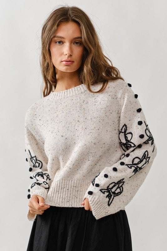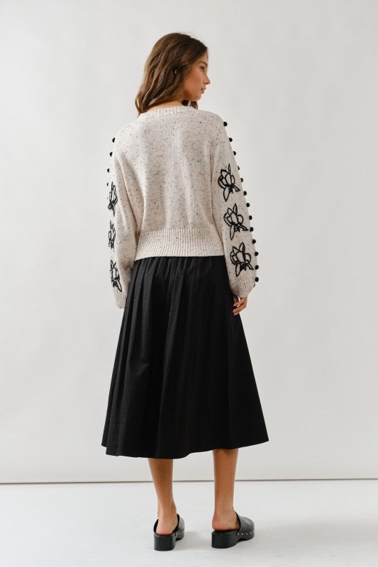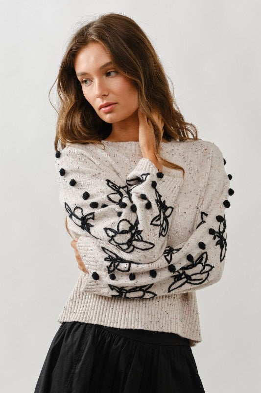 The sweater is crafted from a soft, knit material, The design features unique floral embroidery on the sleeves, and pom-pom detailed adding a touch of elegance and femininity to the otherwise minimalist look. -Embroidery -Pom-Pom -Cropped
