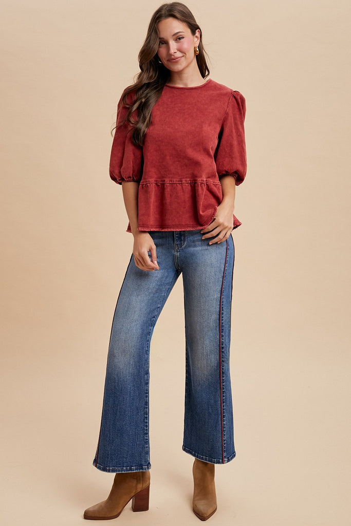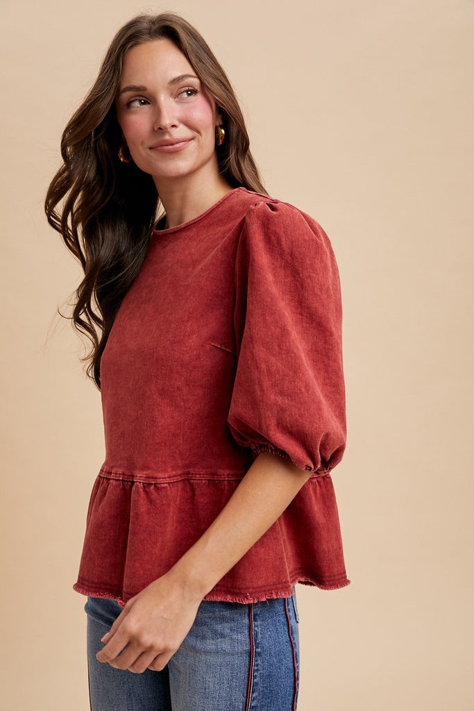 DENIM RUFFLE DETAIL BACK-BUTTON BLOUSE - WASHED DENIM - PUFF 1/2 SLEEVE - RUFFLE DETAIL FRONT&BACK - RAW EDGE HEM - BUTTON-DOWN CLOSURE BACK - RELAXED FIT