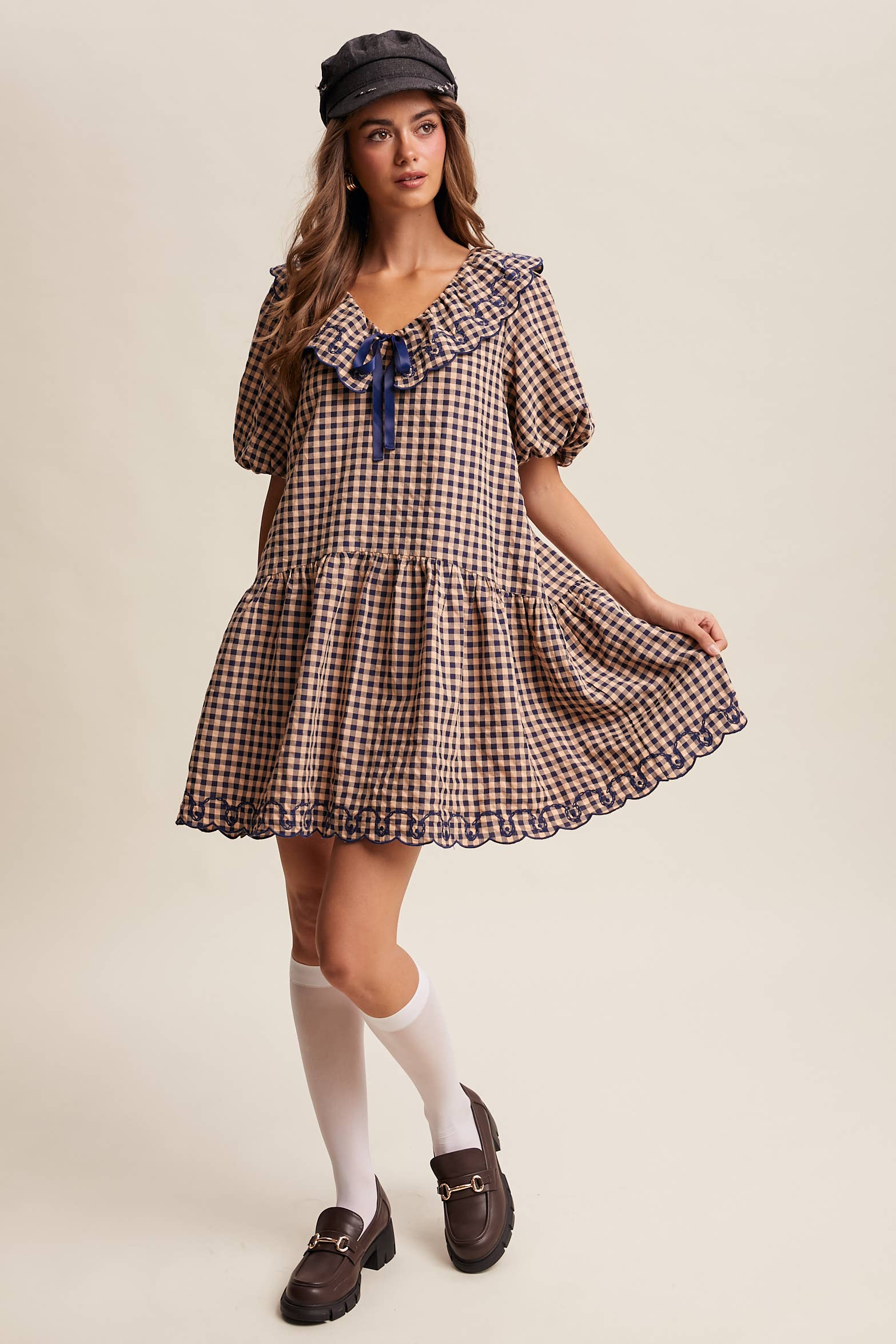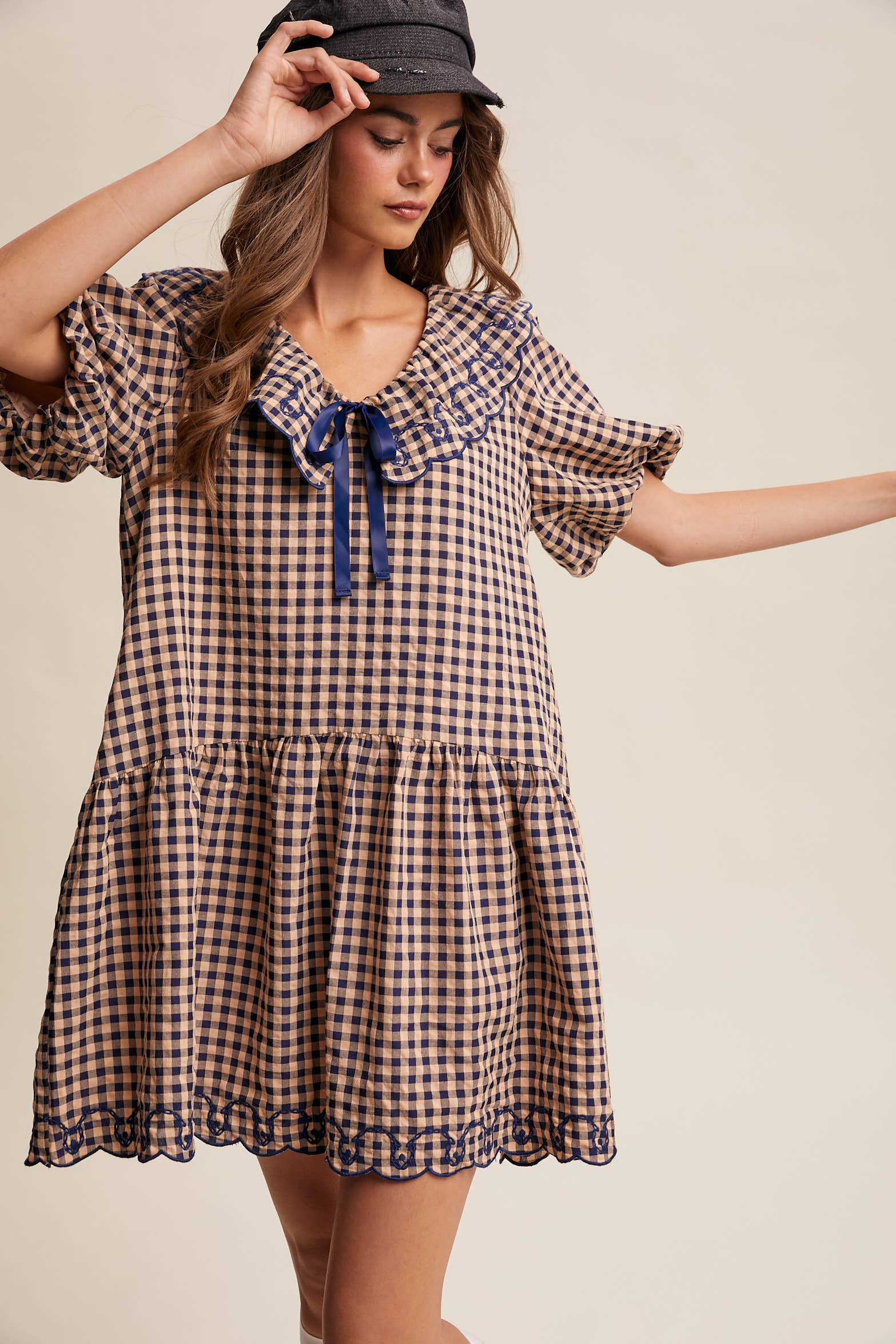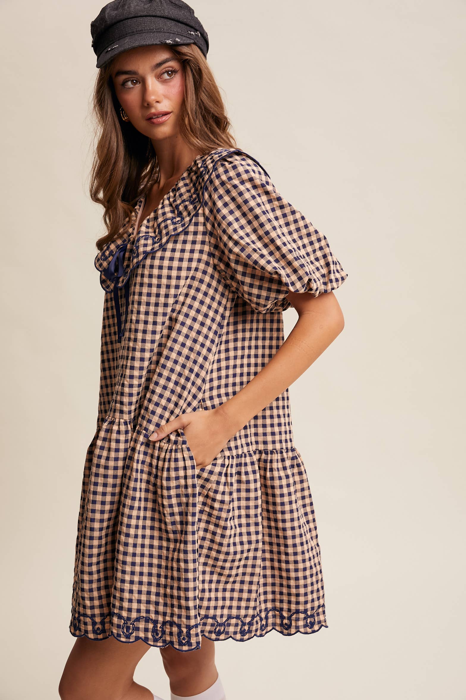 - Lightweight Woven Fabric: Soft gingham check with an airy drape for all-day comfort - Statement Ruffle Collar: Double-layered scalloped ruffle neckline finished with contrast embroidery - Ribbon Tie Front: Adjustable satin bow adds a sweet, feminine touch - Puff Short Sleeves: Gathered sleeves with elasticized hems for a playful, voluminous shape - Tiered Babydoll Silhouette: Flowy, easy A-line shape with a gently gathered skirt - Embroidered Hemline: Contrast scalloped embroidery along the hem for a polished, detailed finish - Lined: Fully lined for smooth, comfortable wear - Pockets: Discreet side pockets for everyday convenience - Model is 5' 9" 29-23-34 and wearing a size Small Charming and effortlessly stylish, this gingham dress blends vintage-inspired sweetness with modern wearability-perfect for adding a touch of boho charm to your everyday lineup or pairing with weekend tops, denim layers, and casual accessories for an easy standout look.