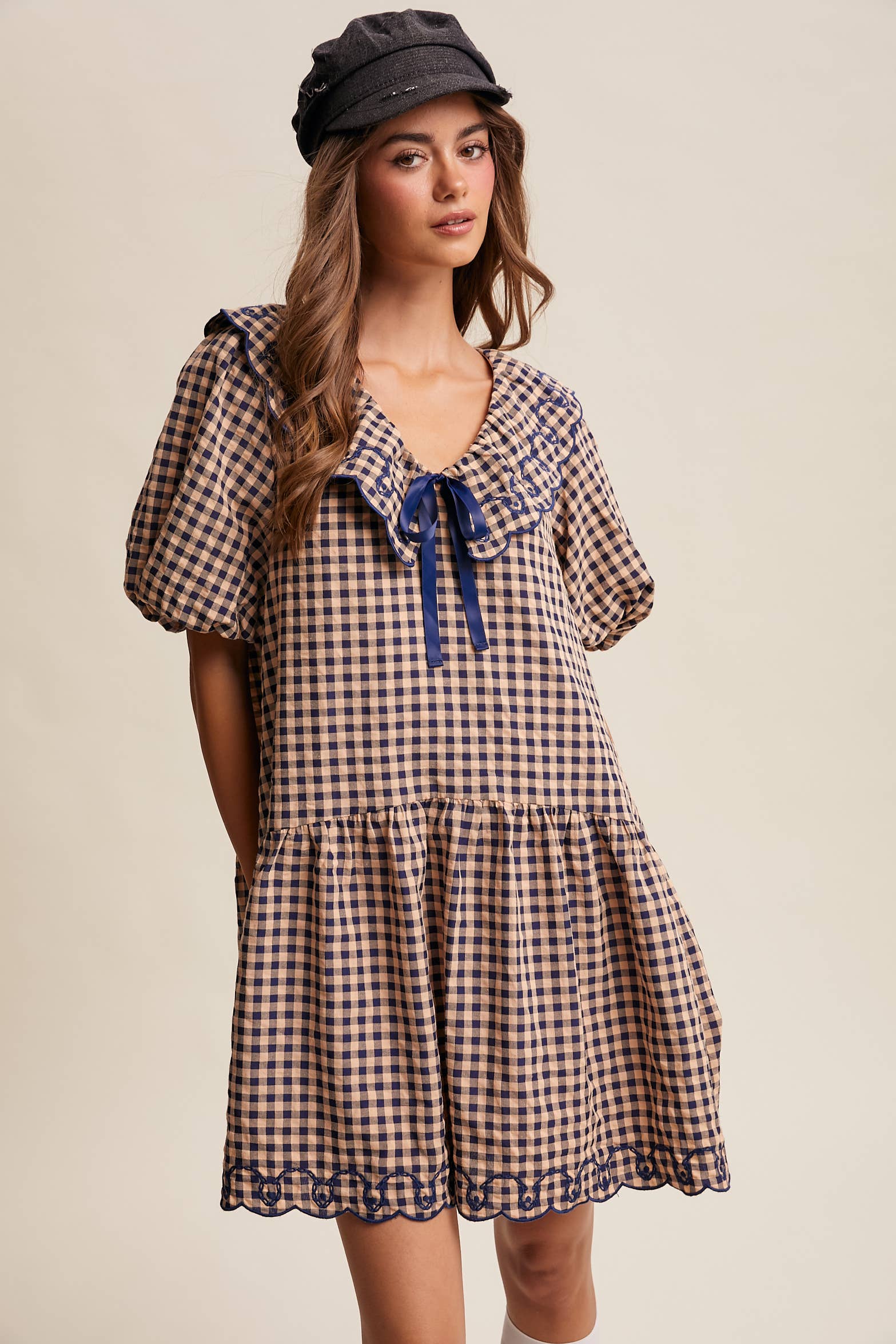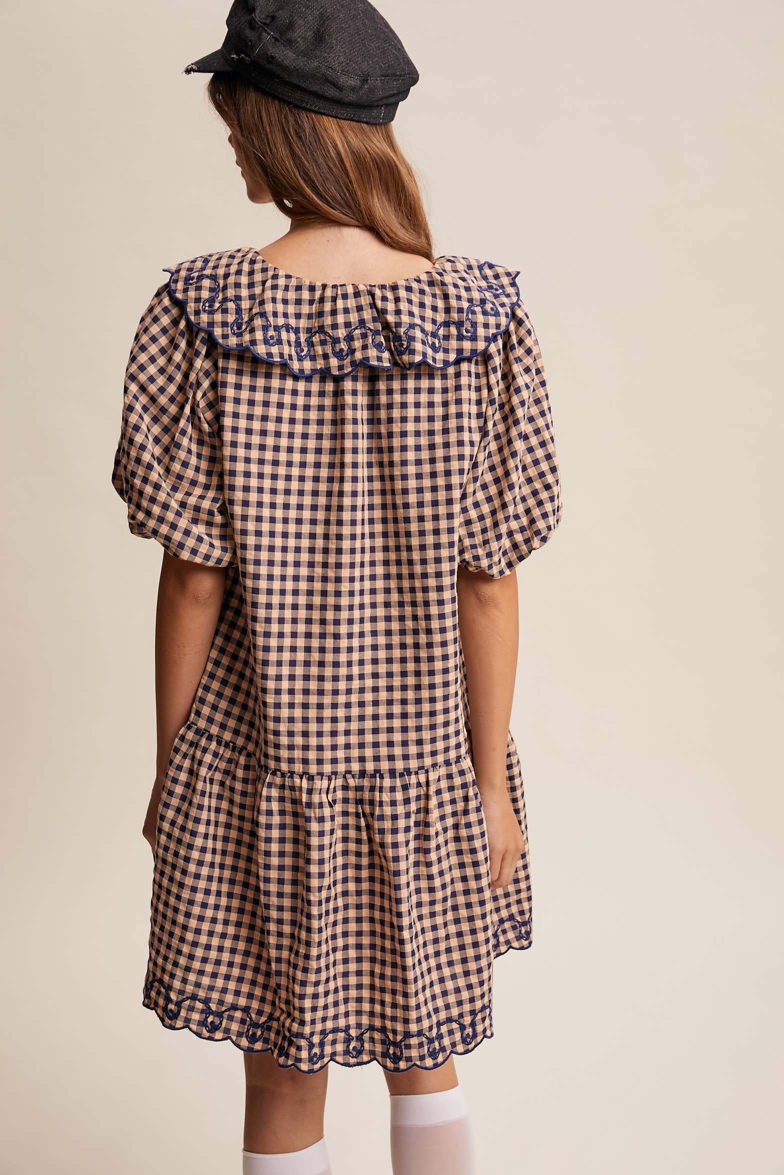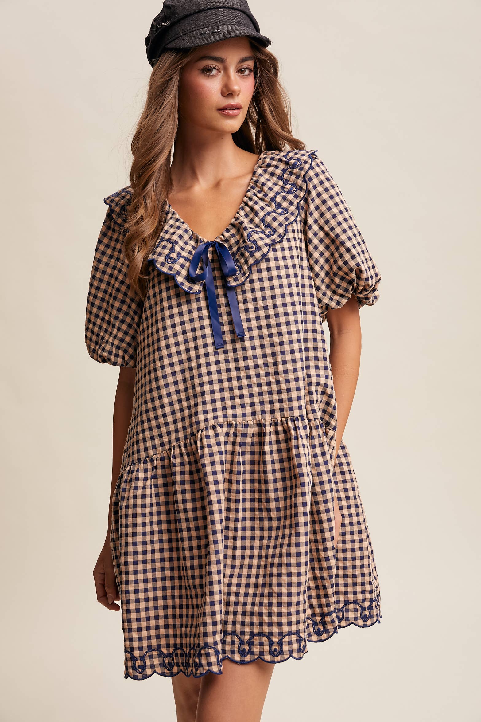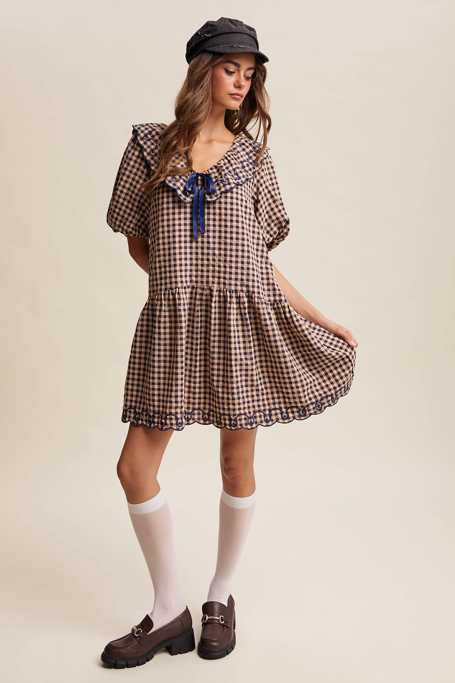 - Lightweight Woven Fabric: Soft gingham check with an airy drape for all-day comfort - Statement Ruffle Collar: Double-layered scalloped ruffle neckline finished with contrast embroidery - Ribbon Tie Front: Adjustable satin bow adds a sweet, feminine touch - Puff Short Sleeves: Gathered sleeves with elasticized hems for a playful, voluminous shape - Tiered Babydoll Silhouette: Flowy, easy A-line shape with a gently gathered skirt - Embroidered Hemline: Contrast scalloped embroidery along the hem for a polished, detailed finish - Lined: Fully lined for smooth, comfortable wear - Pockets: Discreet side pockets for everyday convenience - Model is 5' 9" 29-23-34 and wearing a size Small Charming and effortlessly stylish, this gingham dress blends vintage-inspired sweetness with modern wearability-perfect for adding a touch of boho charm to your everyday lineup or pairing with weekend tops, denim layers, and casual accessories for an easy standout look.