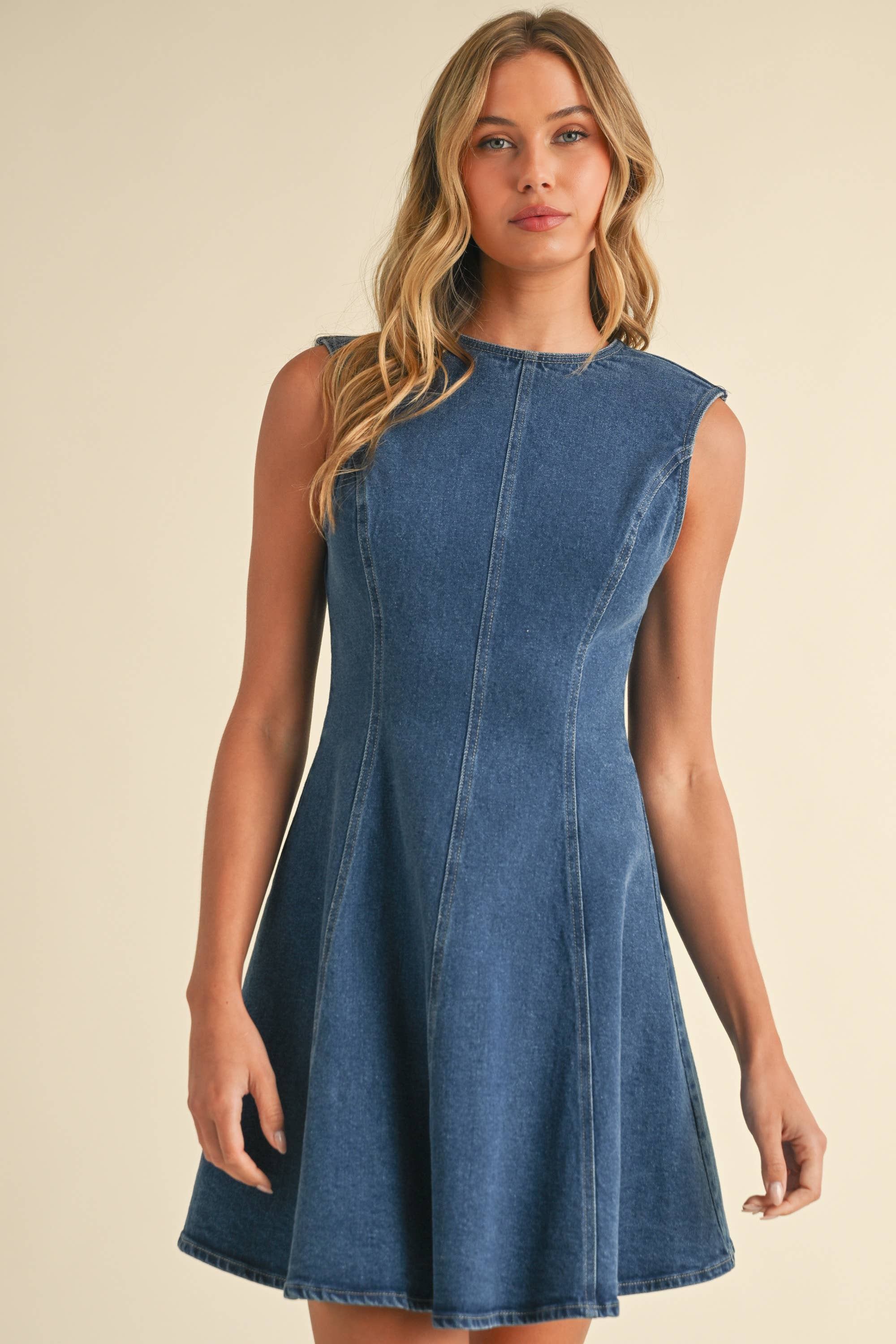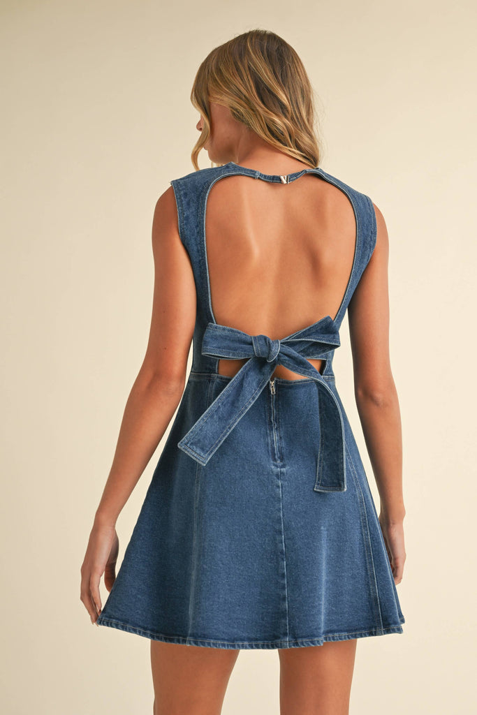 DENIM BACKLESS A LINE MINI DRESS WITH BACK BOW DETAIL 90% COTTON 8% POLYESTER 2% SPAN