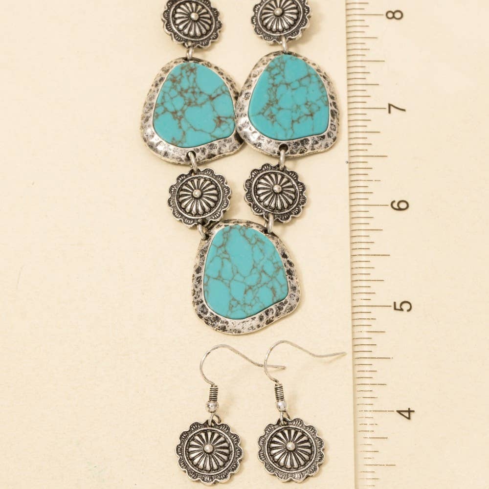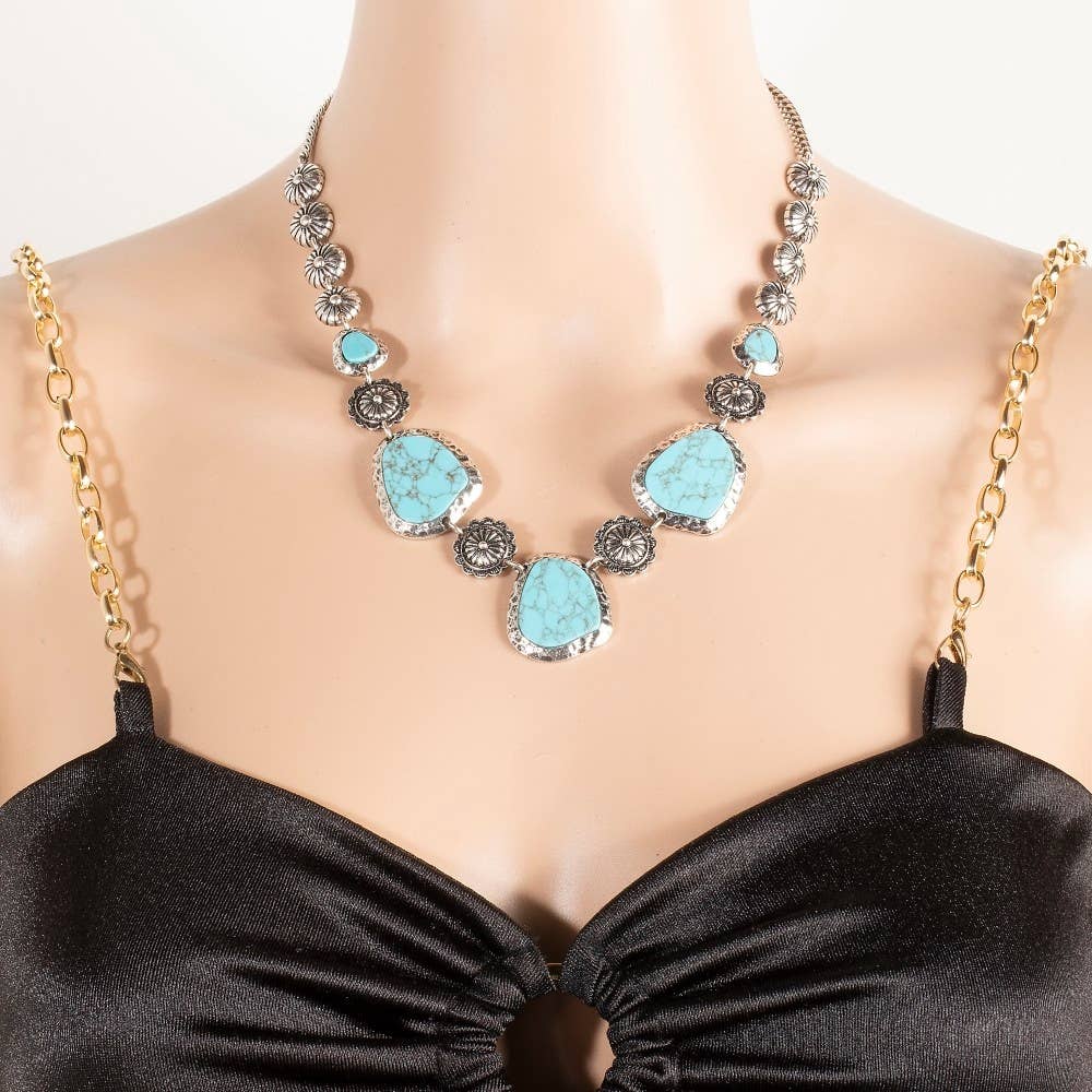 A classic design with a contemporary twist, this chain necklace displays a unique western turquoise concho set design. Elevate your everyday style with this versatile chain necklace, a simple yet impactful addition to your fashion repertoire. Available in SBTQ. This item is sold in packs of 1.