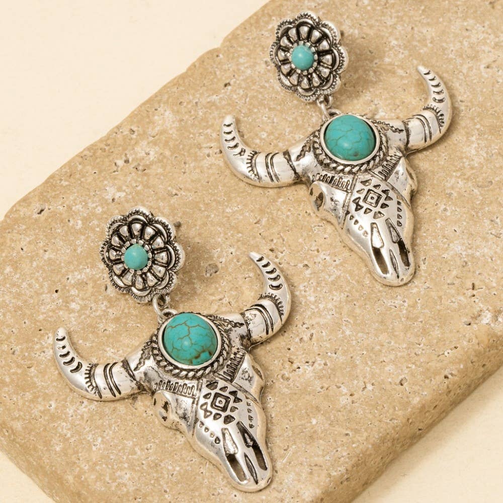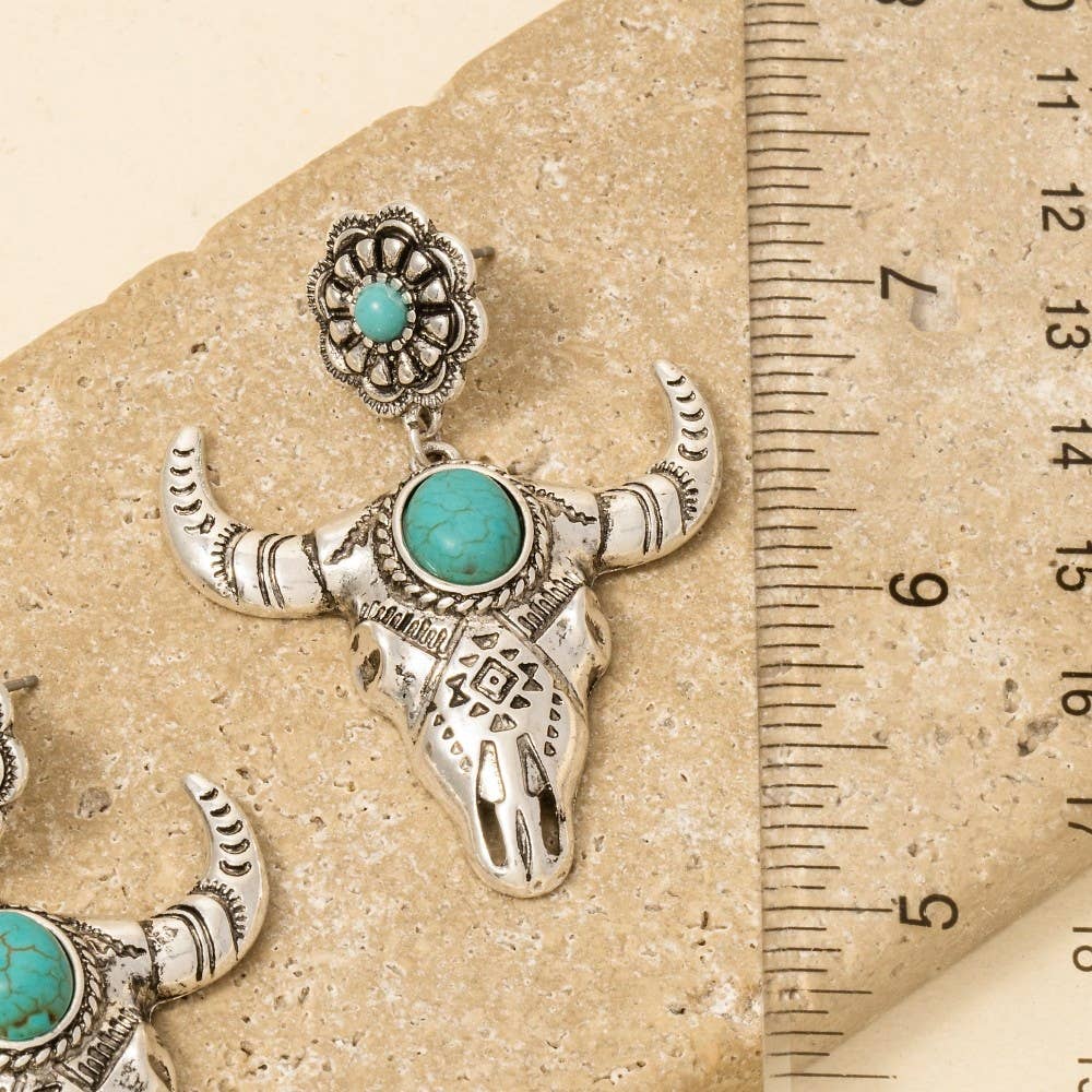 Effortlessly chic and sophisticated, this pair of dangle earrings presents a striking western turquoise studded bull head and flower design. The perfect way to complete any outfit, whether you're dressing up or keeping it casual. Available in SBTQ. This item is sold in packs of 1.